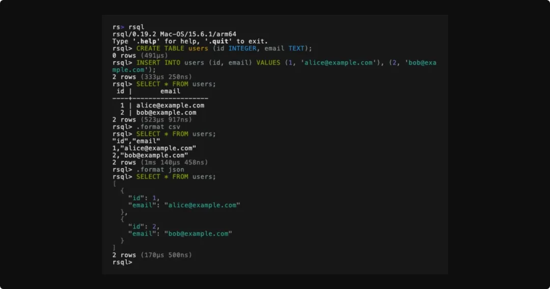 rsql 是一款免费开源、功能丰富的 SQL 命令行客户端(CLI),可以为多种关系型数据库、本地文件、云数据服务提供统一的 SQL 查询接口。