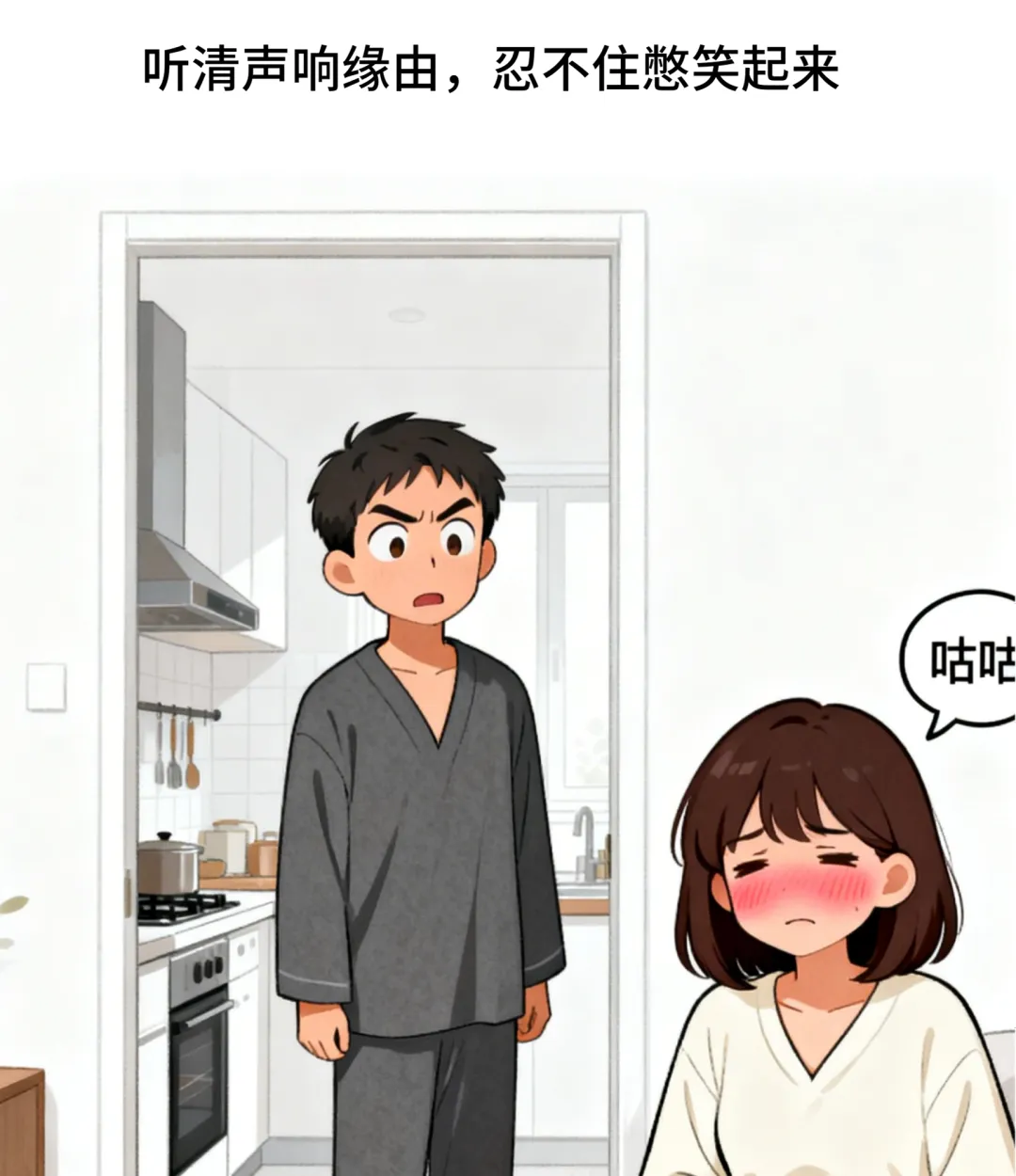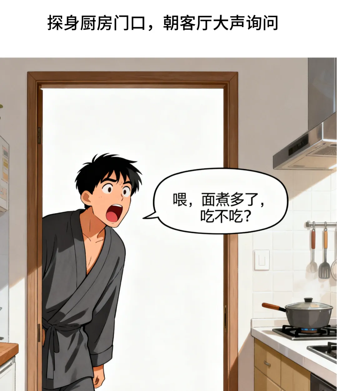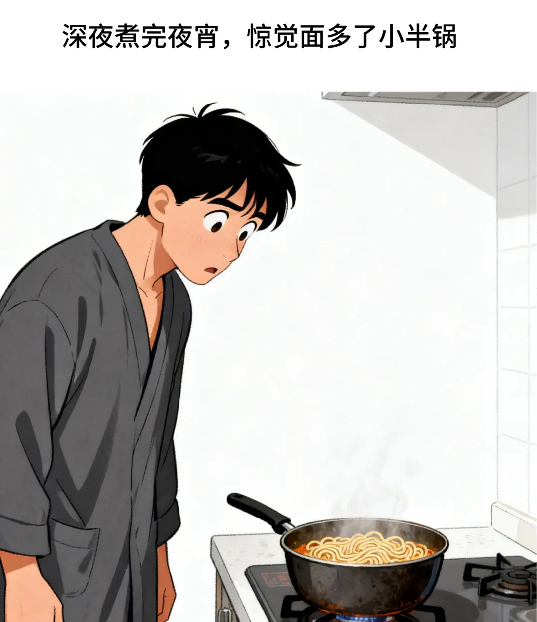 趣味漫画:深夜煮完夜宵面剩小半锅,我朝客厅喊:喂,面煮多了,吃不吃?随即就听见妻子的肚子咕咕叫个不停.