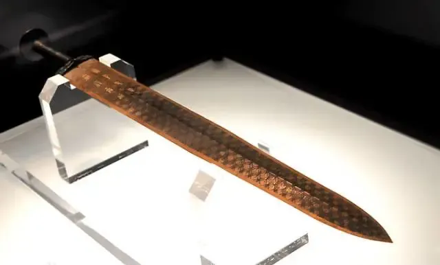 这柄通体暗花的剑叫越王勾践剑,剑身带着波浪纹,千年不生锈,剑柄一摸还有点凉,剑身刻着鸟篆八个字,现代人用的记忆合金都自愧不如,专家说试了多次,硬是做不成一把像样的,真服了。