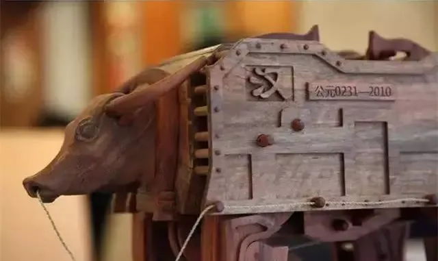 这木牛造型呆萌,有点像积木拼起来的机关家伙,叫木牛流马,三国时诸葛亮拿来运粮草的神器,外行说拉一百多斤粮走老远没问题,现在啥3D打印也没办法还原里面的暗格机关,把个牛拍下来能做模型,真让它跑起来,还是给难住了。