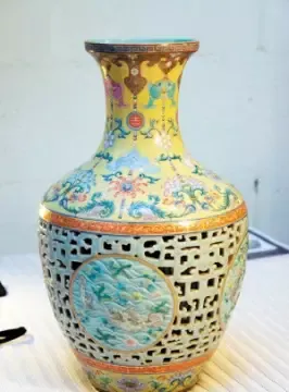 这瓶子最妙的地方在于一瓶套一瓶,外头一层镂空,里头还有画,叫乾隆镂空转心瓶,用手一转里面景致全变,全是细细的孔和窗眼,烧一遍得好几块配着装起来,谁见了都摇头,别说仿,装都不敢装。