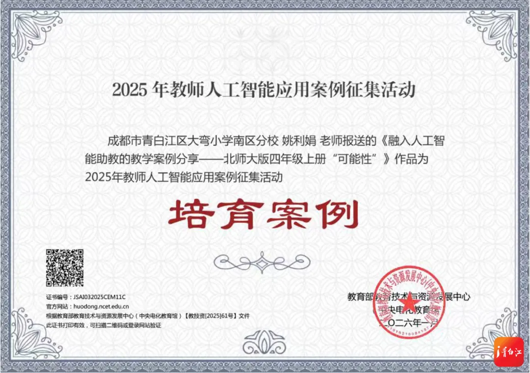 2025年,在教师人工智能应用案例评选中,成都市20件案例入选国家级名单,位居同类城市首位,且是四川省唯一囊括创新、典型、培育三类奖项的城市。这份“成都答卷”中,大弯小学南区姚利娟老师的《可能性》成功入选“培育案例”,成为区域推进AI教育的一个生动样本。