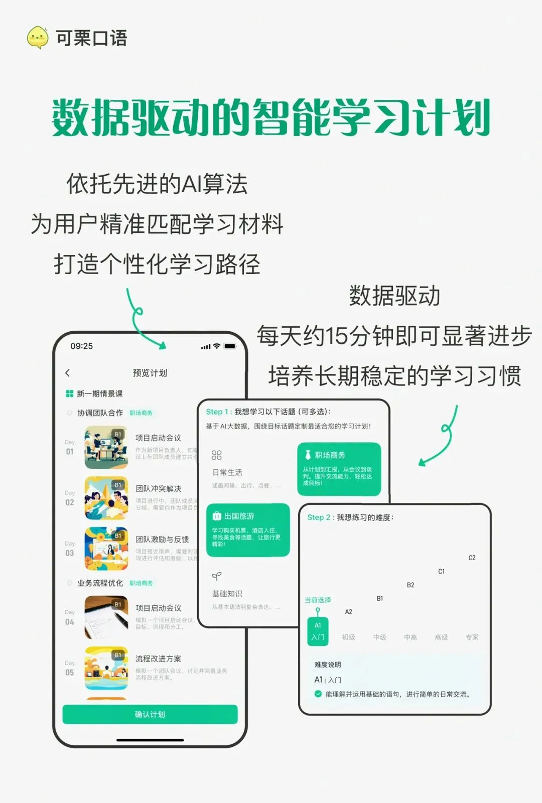 零基础学习者最头疼的就是不知道从哪开始学,可栗口语完全解决了这个问题:首次使用会先做基于CEFR标准的水平测试,精准定位你的真实能力,之后每日智能定制学习计划,会根据你的水平和学习目标自动安排当天的朗读、对话练习内容,不用你自己费心找素材,跟着练就行。
