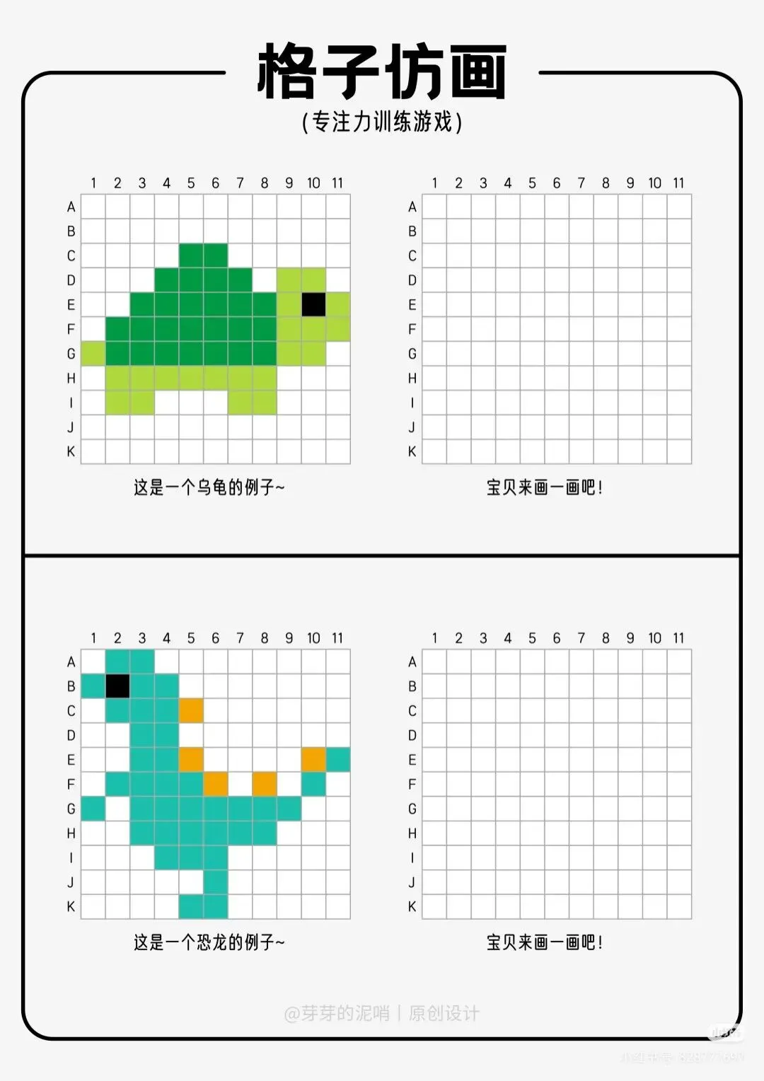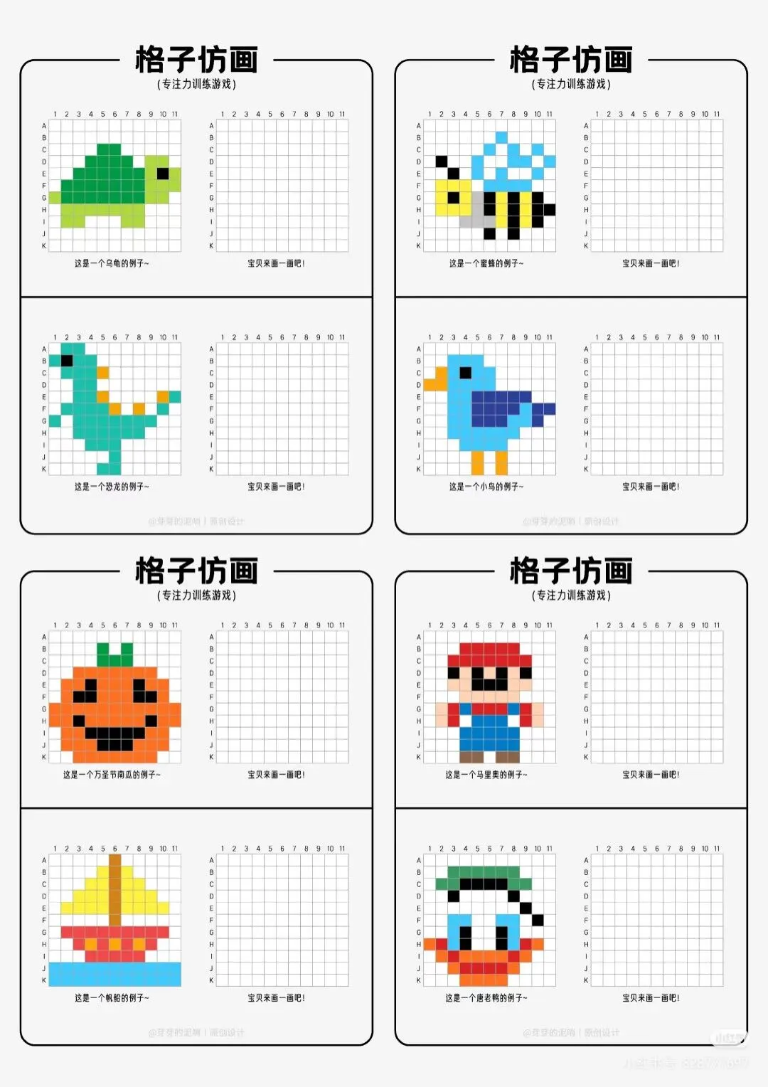 训练核心能力:每个图案均由小格子组成,引导孩子按提示观察、填色,有效锻炼手眼协调、观察力与耐心。 -
