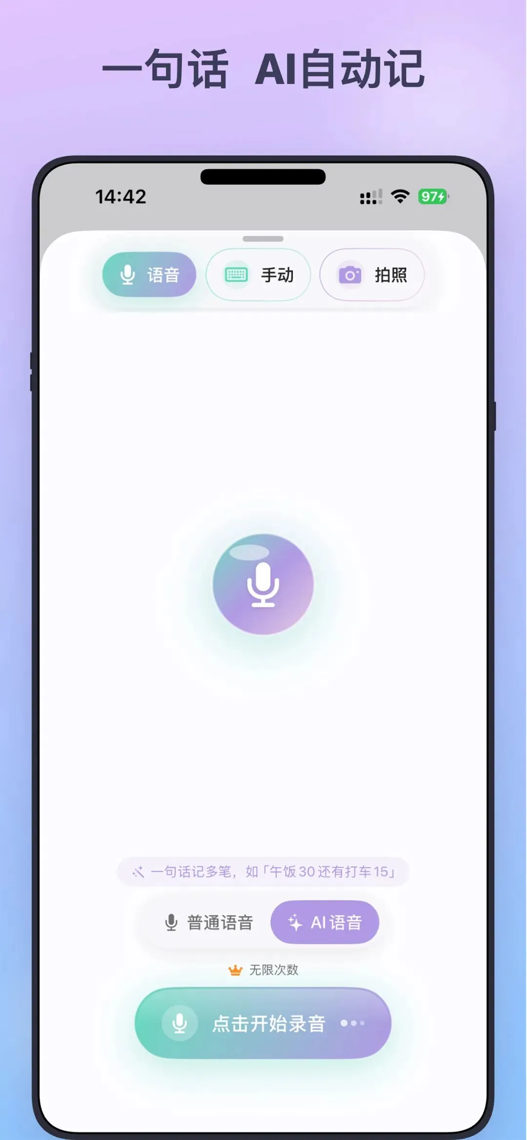 - • AI语音记账:对着手机说”今天买咖啡花了30元”,自动完成记录(适合走路、开车等双手忙碌的场景)