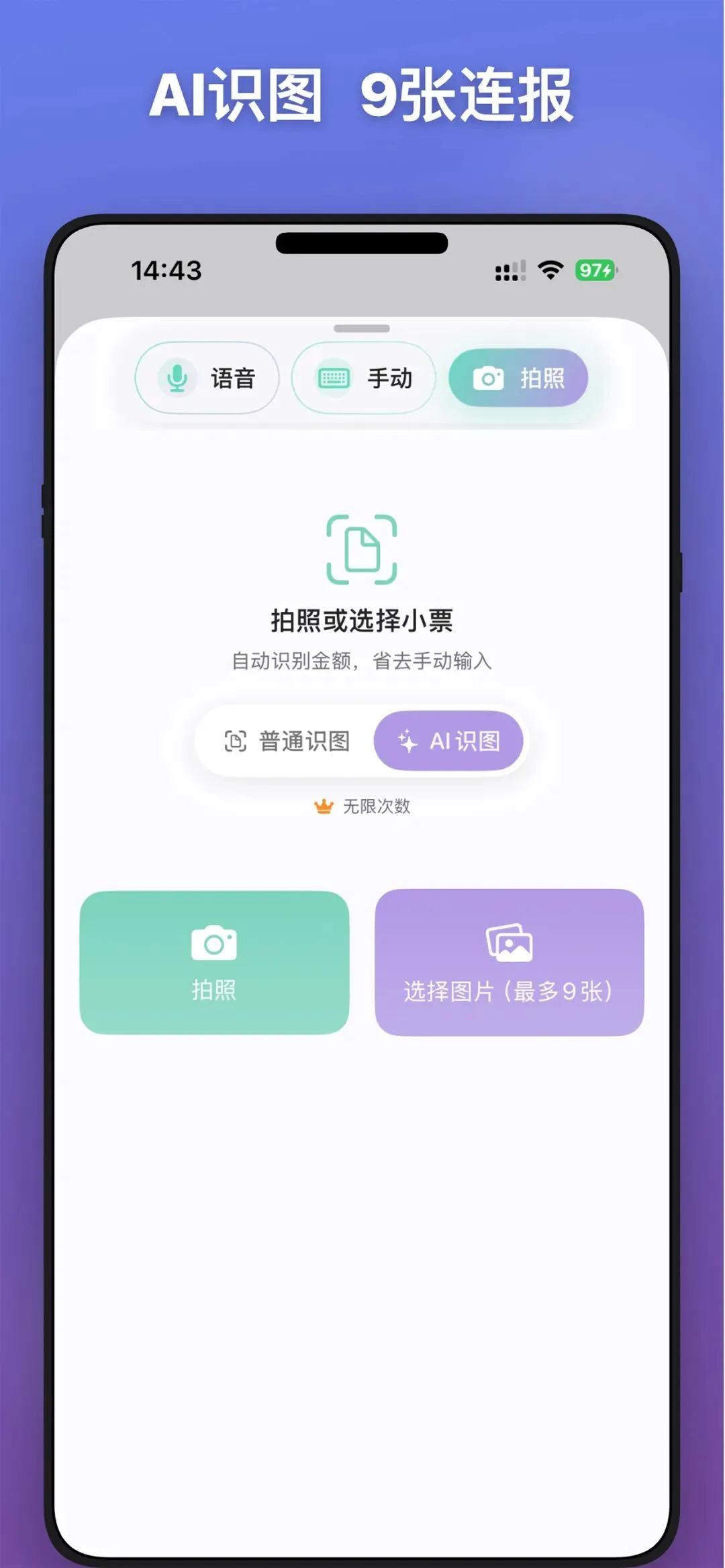 - • AI识图记账:拍张发票或付款截图,AI自动识别金额和商家(适合外出消费时快速记录)