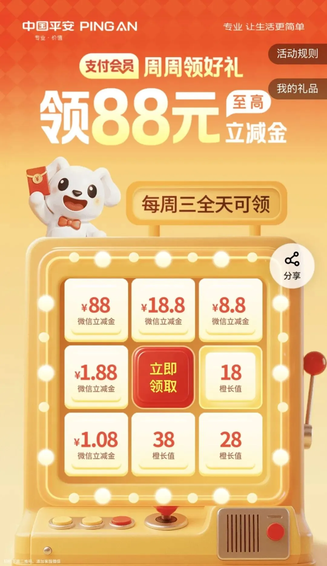 平安借记卡用户,每周三0点抽:1.08-88.88元微信立减金、成长值,周限1次