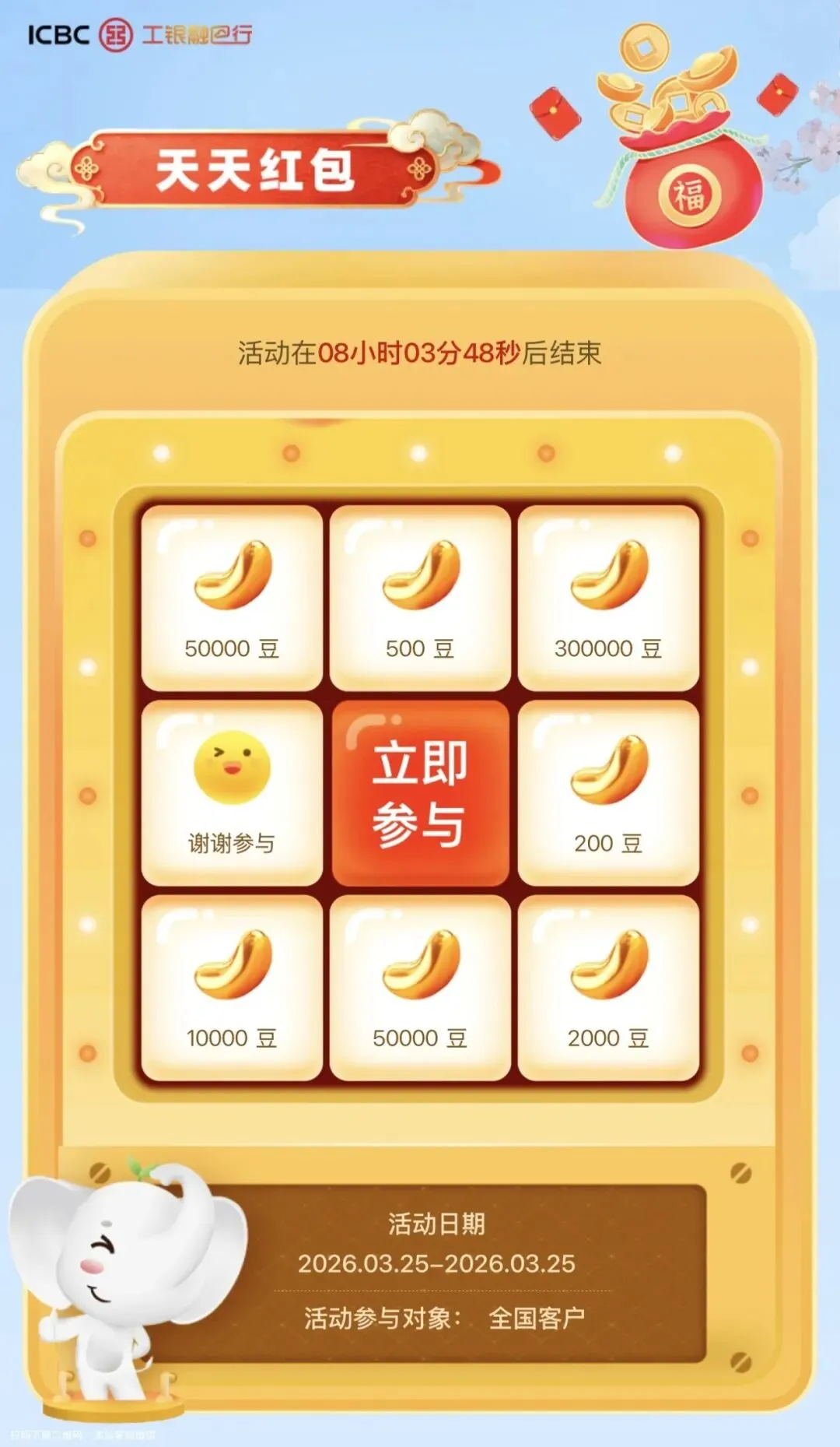 即日起至3月31日,每日8点起抽:30w豆/5w豆/1w豆/2k豆/500豆/200豆