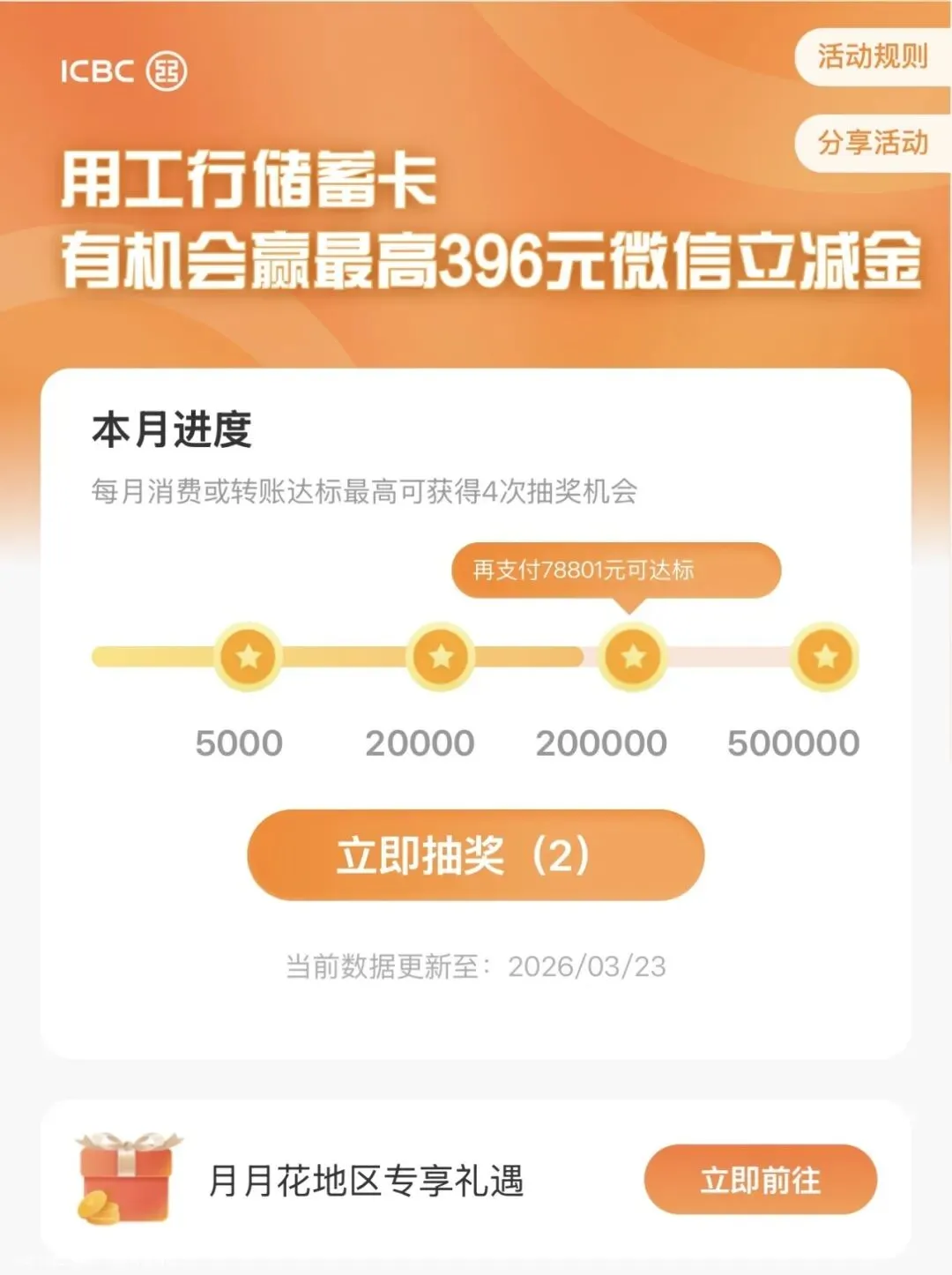 工行报名用户在活动统计期内,使用微信支付绑定工行储蓄卡进行支付(包括消费、转账、红包、二维码付款、零钱充值、部分理财通及部分信用卡还款等),支付金额达5000元(含)、20000元(含)、200000元(含)500000元(含)时均可获得一次抽奖机会,有机会抽取2-99元微信立减金。