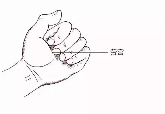 按摩劳宫穴,用左手大拇指指端顶住右手掌心的劳宫穴,垂直向下按压,其余的手指则按压在手背上,力度由轻到重,一压一松,持续1~2 分钟即可。