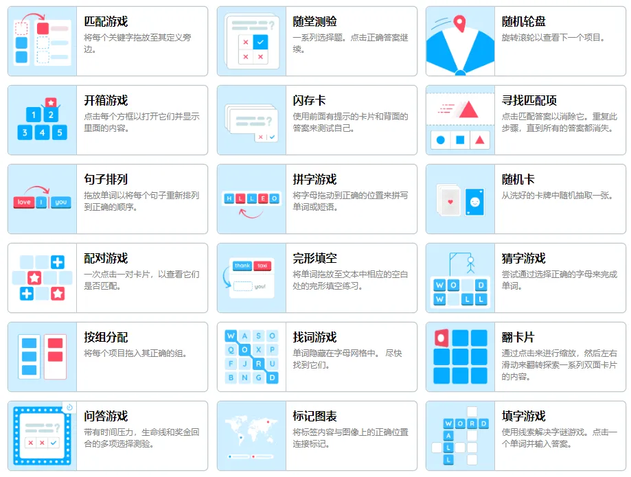 Wordwall 提供超过30种模板,涵盖选择题、拼图、连线、填空、分组排序等,适用于各类学科和教学目标。