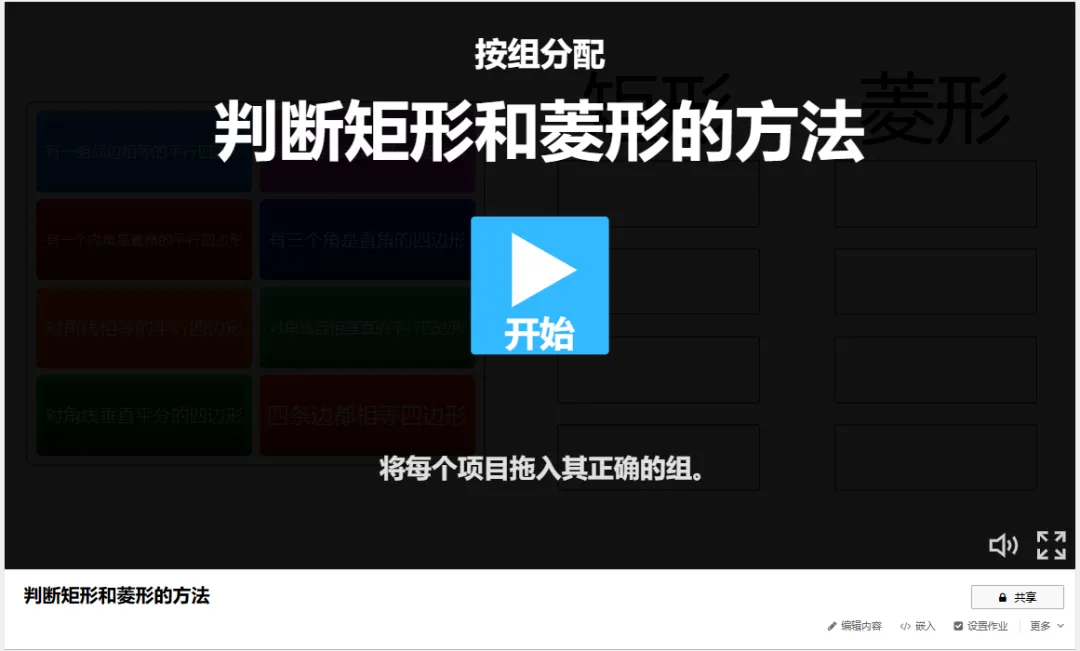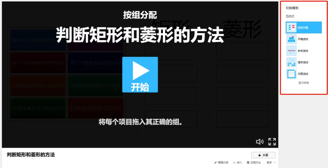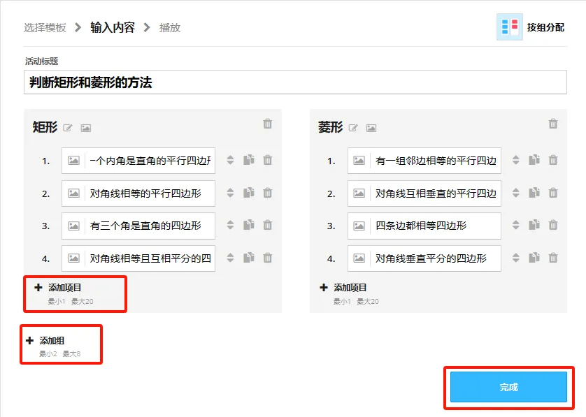 以“判断矩形和菱形的方法”为例:点击“创建活动”,选择“按组分配”模板;