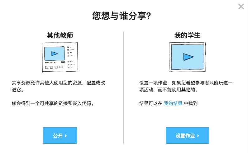 教师可以在个人账户中管理所有活动,并通过“共享”按钮将游戏分享给同事或学生。