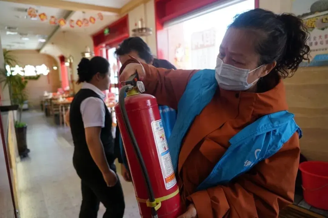 社区干部入商户开展日常安全检查。伊州区融媒体中心记者 杨俊超摄