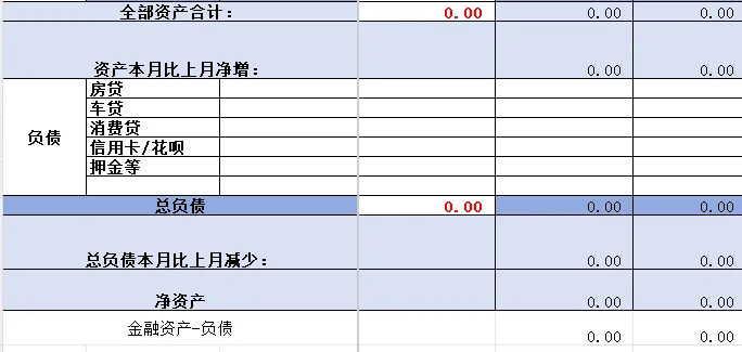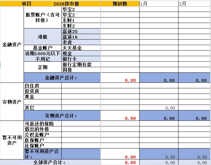 金融资产按各个投资账户登记,月底查下账户的实际市值填入;实物资产主要有房子、黄金饰品等,登记的时候可以打八折登记个大概就好,可少记不宜多计(根据会计的谨慎性原则);暂不可用的资产包括可返还型的保险,公积金、医保账户等。