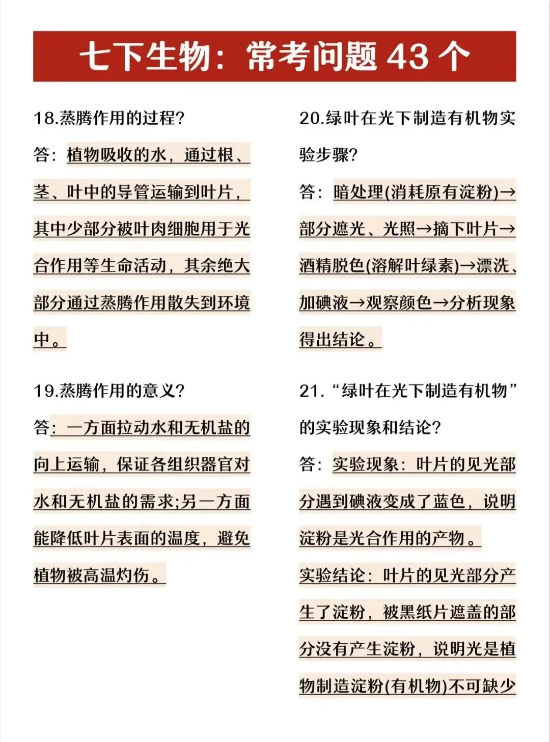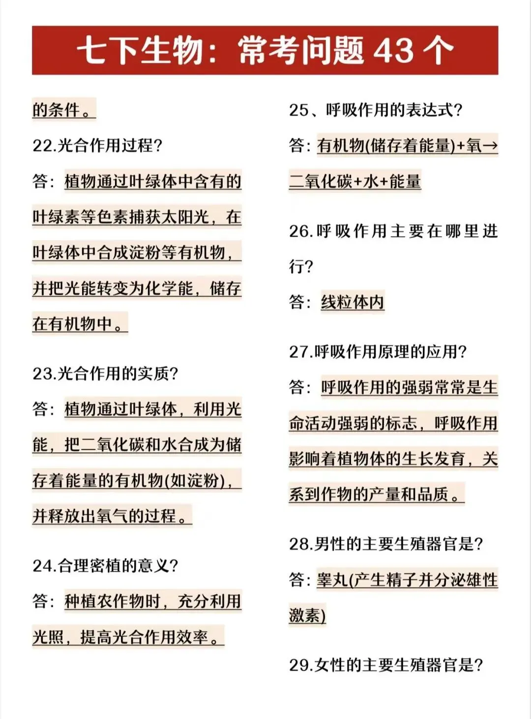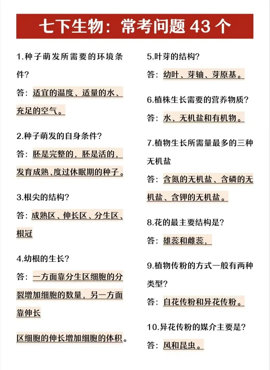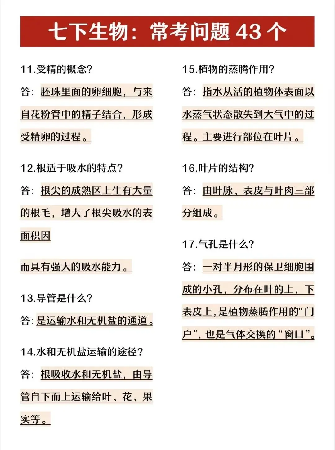 七年级下生物常考43个问题/电子版可打印 以下为部分截图,具体看完整PDF文件 (温馨提示:文末有电子版领取方式) 领取完整电子版: ①:点一点右下角的“赞”和“在看”,感谢支持! ②:点击“关注”,回复资料领取