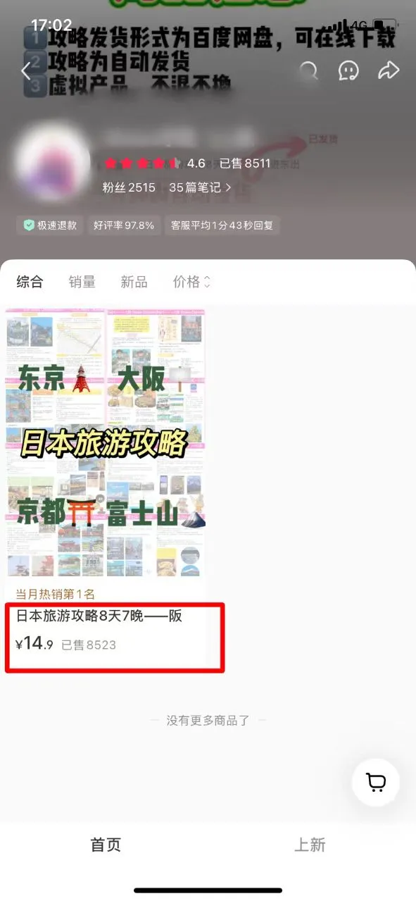 还有个号,仅35篇笔记,靠一份14.9元的日本全攻略卖了8523份,核心就是封面精致、行程规划详细,抓住了用户的核心需求。