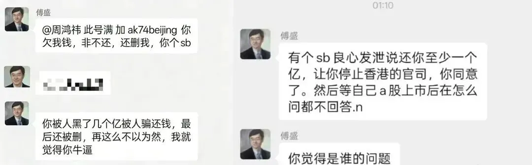 惨遭删除的傅盛,在酒后共同的群聊里控诉红衣大叔欠钱不还,一顿激情输出并翻起旧账。