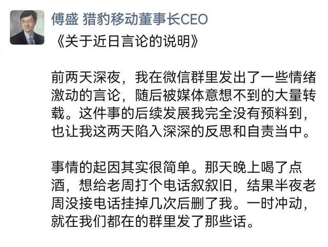 24日凌晨,傅盛发布了酒后冲动致电的《说明》。