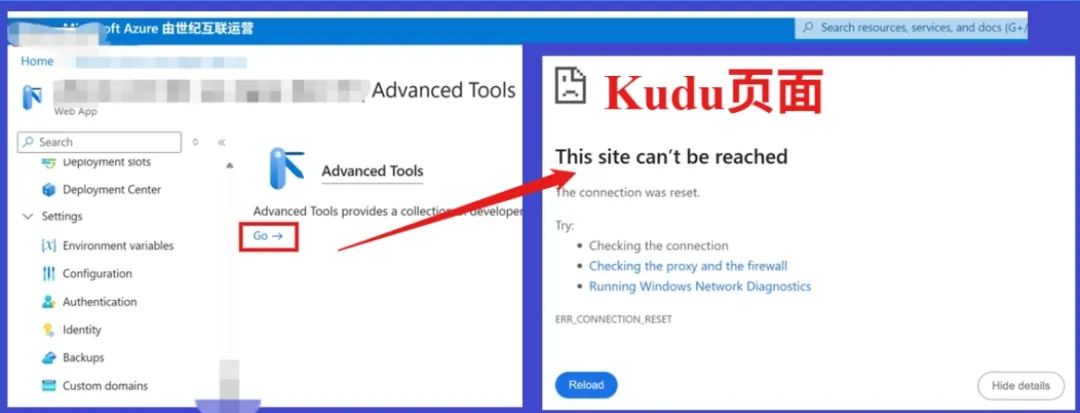 在这个问题中,Web App 配置了网络访问限制,公共网络访问已被禁用。然而,Advanced Tools 实际上运行在一个独立的站点(SCM / Advanced Tools Endpoint)。当网络策略中没有为kudu站点单独放行时,请求会在网络层被直接阻断,最终表现为 Advanced Tools 页面无法访问。