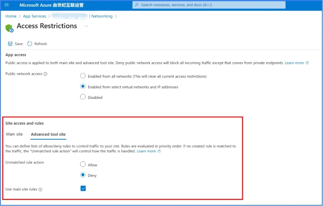 Advanced Tools(Kudu)并不等同于主 Web App 站点,它有自己独立的访问入口和网络规则。