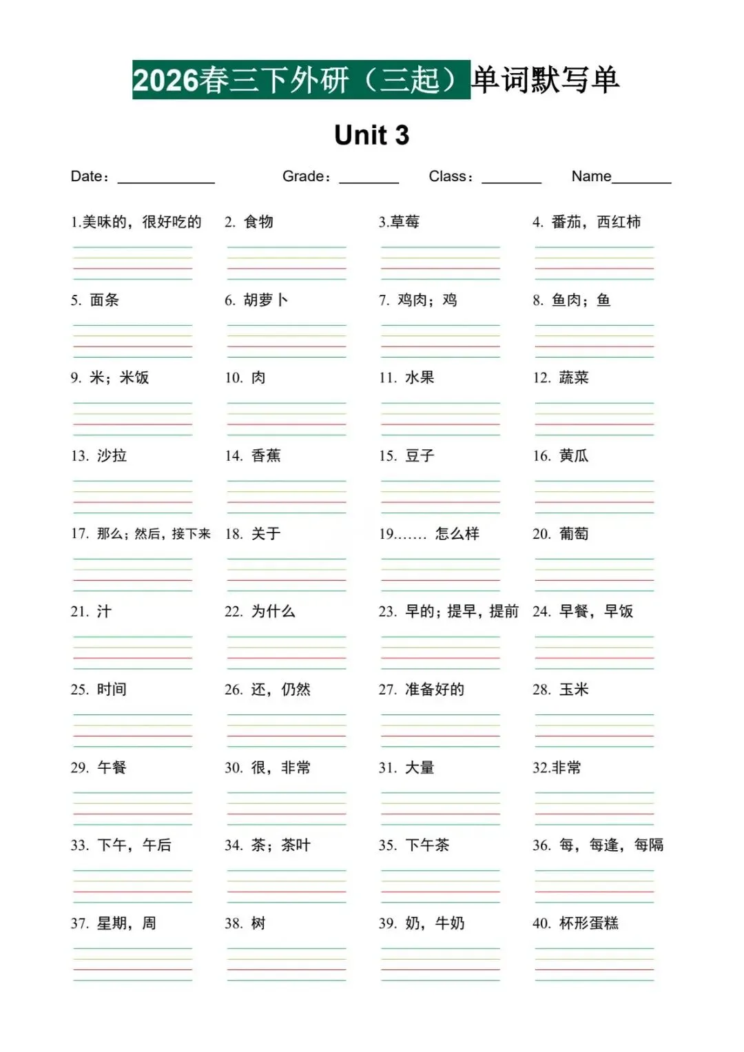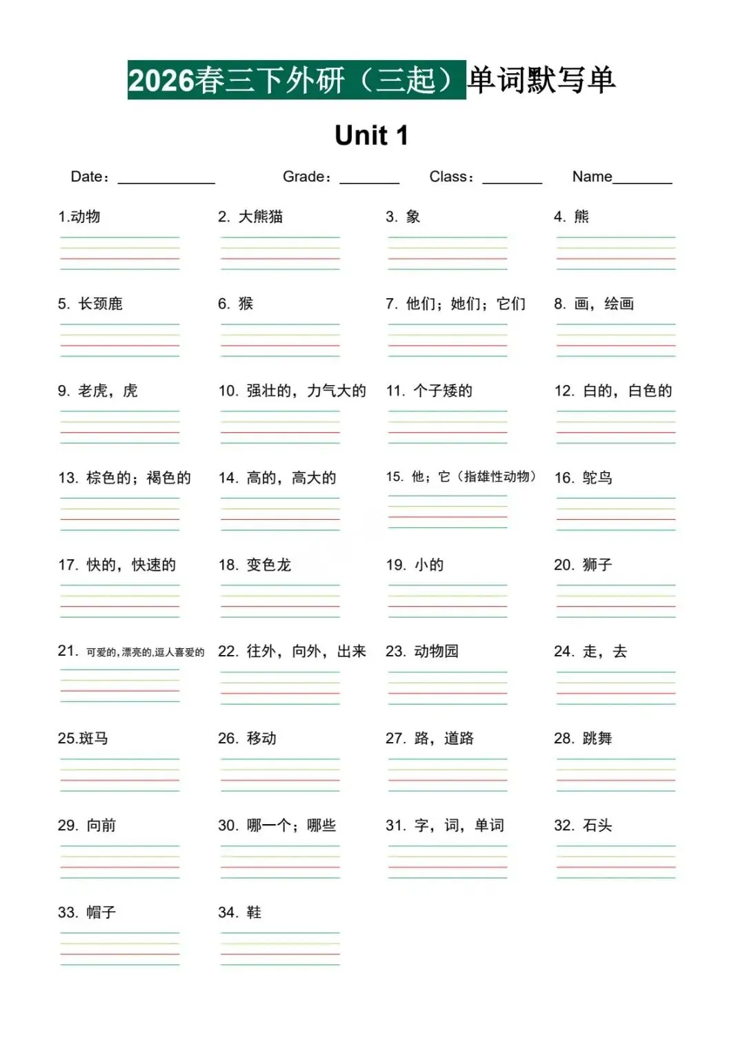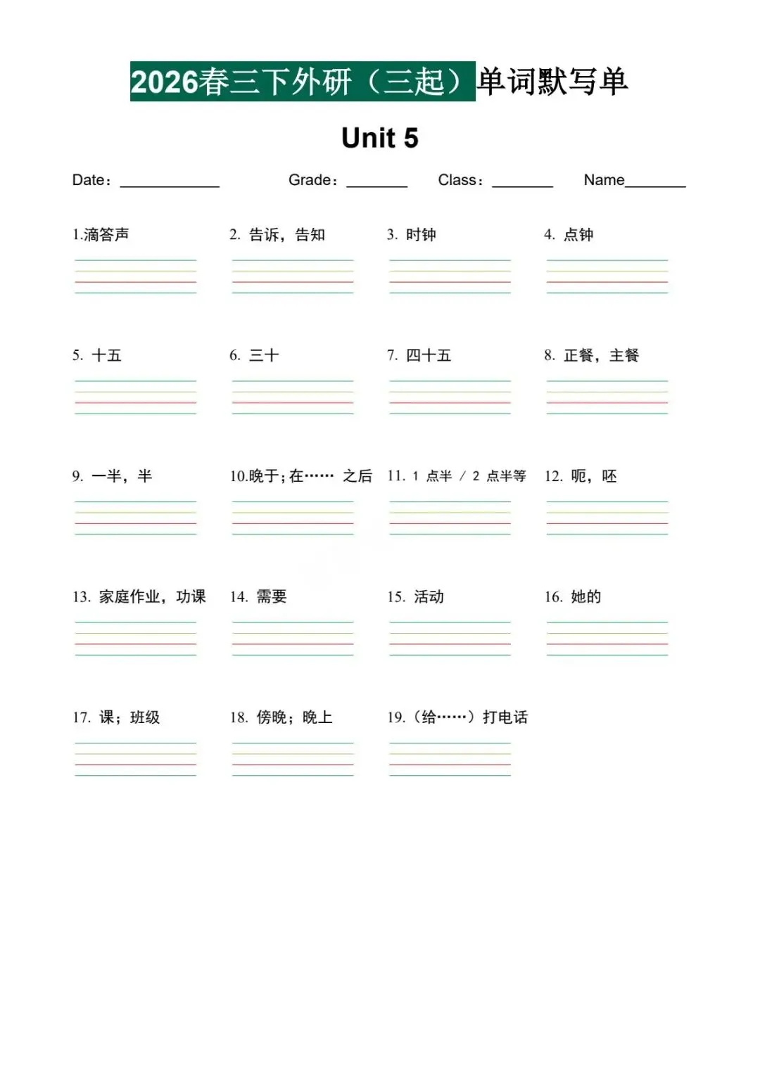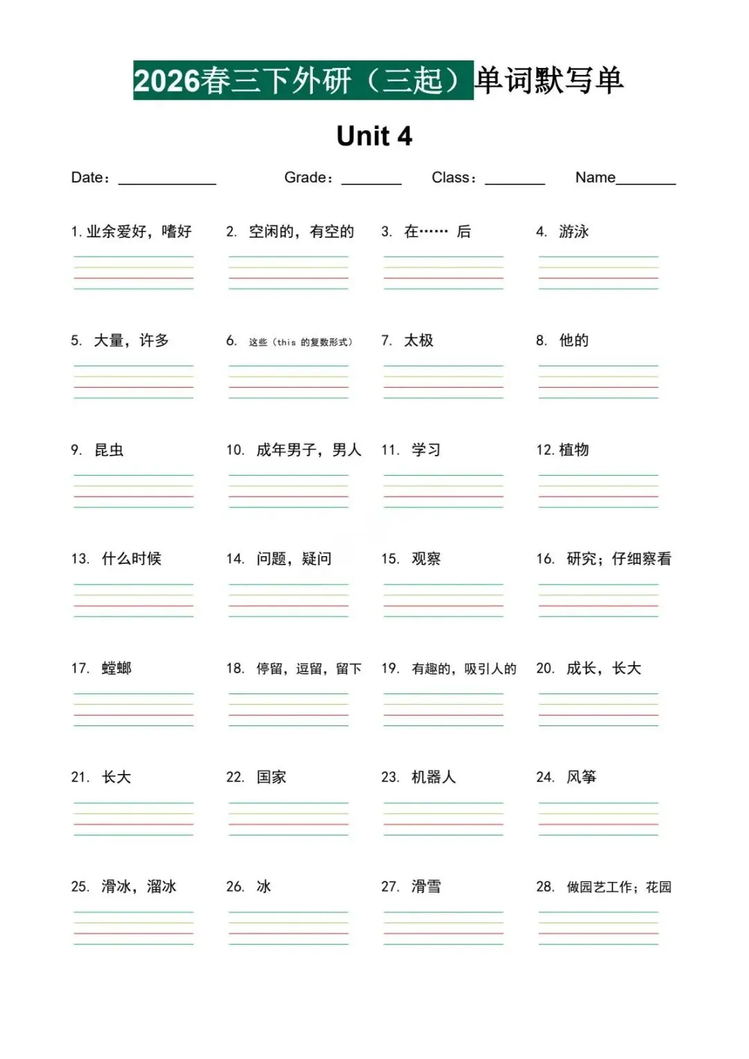 今日课代表给大家分享的是:2026年春三年级下册外研版(三起点)单词默写单,可电子版下载打印。