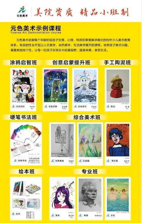 元色美术依据 4-16 岁孩子生理、心理、特质和审美需求确立的校外少儿美术教育阶段性教育体系。以必修课(初级 – 中级 – 高级递进式课程)为主架构,及书法班、专业班、美术爱好者的系统性教学,结合一对一、小班制教学开展,因材施教。并结合陶艺、水彩画、卡通漫画、彩铅画、水墨画等开设一系列特色课程,为孩子提供美术能力学习、艺术活动与欣赏、美术作品参赛等美术教育服务。