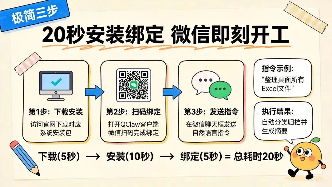 理论上的优势需要极致的体验来落地。QClaw最令人称道的一点,就是将强大的AI Agent能力,封装成了一个几乎零学习成本的简单操作。下面这个三步教程,任何人都能在5分钟内完成从零到一的部署。