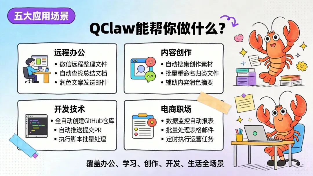 理解了“是什么”和“怎么用”之后,最关键的问题是:QClaw到底能为我做什么?答案覆盖了从职场到生活、从学习到创作的方方面面。我们通过六大高频核心场景,结合真实可用的指令示例,来感受其如何切实提升效率。