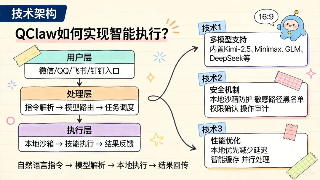 QClaw的技术根基是2026年初火爆全球的开源项目——OpenClaw。腾讯团队在其基础上进行了深度优化和产品化封装,核心目标就是降低使用门槛。其架构可以简化为四层协同:客户端常驻本地,负责接收指令、调用技能并操控电脑软硬件;微信/QQ端作为交互入口,负责指令的接收与结果的回传;模型层智能调度内置的Kimi-2.5、Minimax、GLM、DeepSeek等国产大模型来理解用户意图;技能层则管理着超过5000个可插拔的Skills,是具体能力的执行单元。