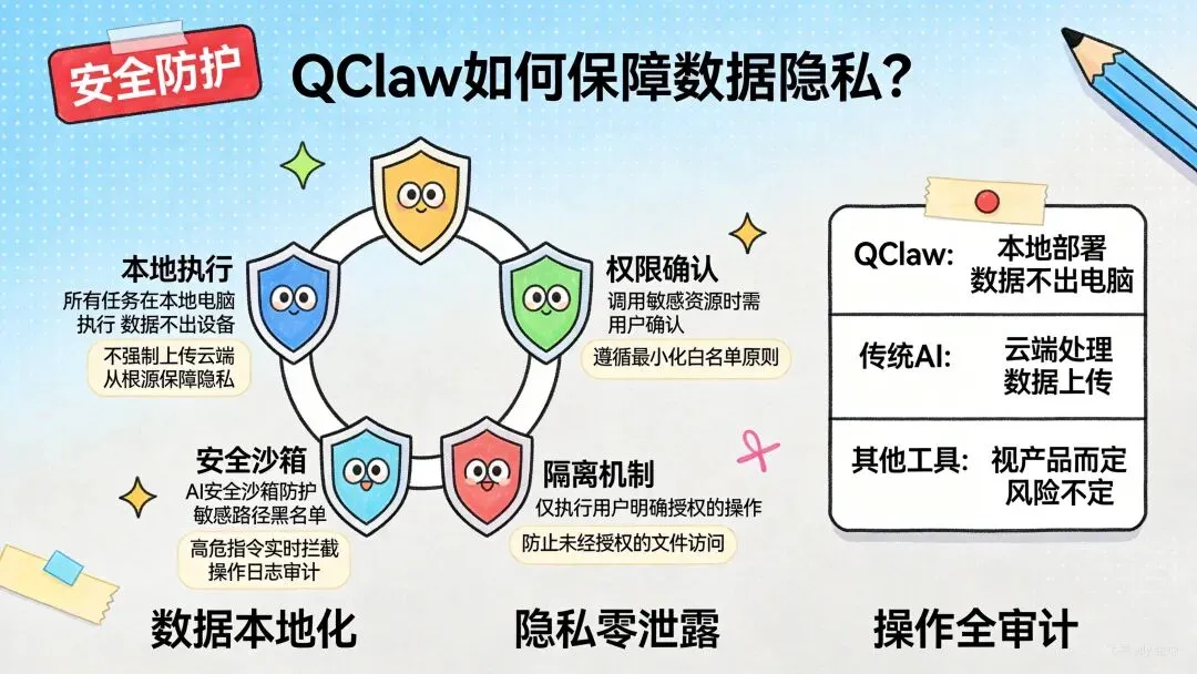 安全机制是QClaw设计的重中之重,也是其敢于主打“本地部署”的底气。其安全理念核心是“数据不出本地,操作尽在掌控”。首先,所有AI运算和文件处理都在用户本地电脑完成,敏感数据无需上传至任何第三方服务器。其次,通过与腾讯电脑管家深度集成,可一键开启“AI安全沙箱”,提供系统级防护。该沙箱能对AI生成的操作指令进行语义级扫描,拦截潜在的高危行为(如格式化磁盘、修改系统文件等)。