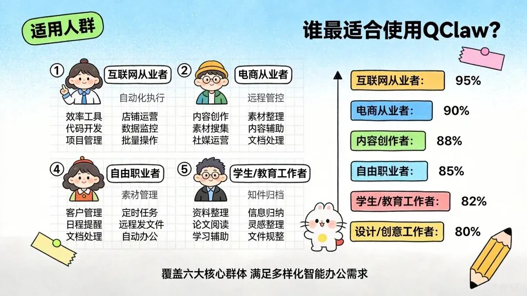 并非所有工具都适合所有人。QClaw的强大在于其场景的广泛适应性,但不同人群从中获取的价值核心各有侧重。通过分析六类核心用户画像,你可以更准确地判断它是否是提升你个人生产力的“利器”。