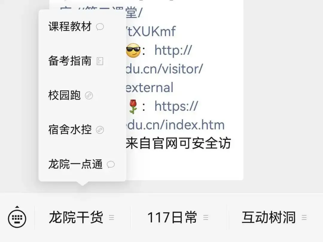 “备考指南”与“课程教材”延续原有功能,继续提供考试咨询及专业课程学习资源。“校园跑系统”与“宿舍淋浴水控”为本次新增入口,分别链接至学校官方校园跑应用及宿舍水控系统,用户点击后可直接跳转,便于查询运动记录与淋浴用水情况。“龙岩一点通”集中整合了三个校内常用服务入口,包括图书馆座位预约、访客入校预约及学校官方网站主页。以上链接均来自学校官方渠道,可安全访问。
