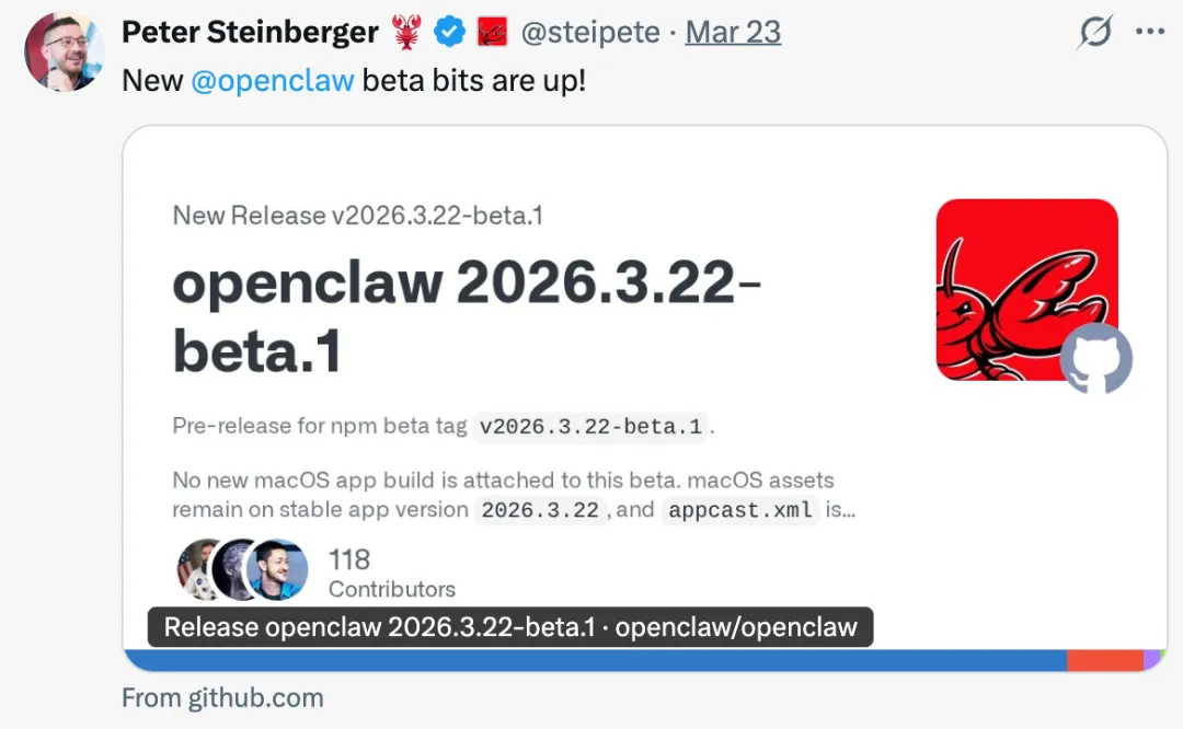 3月22号凌晨,OpenClaw推送了2026.3.22-beta.1版本。