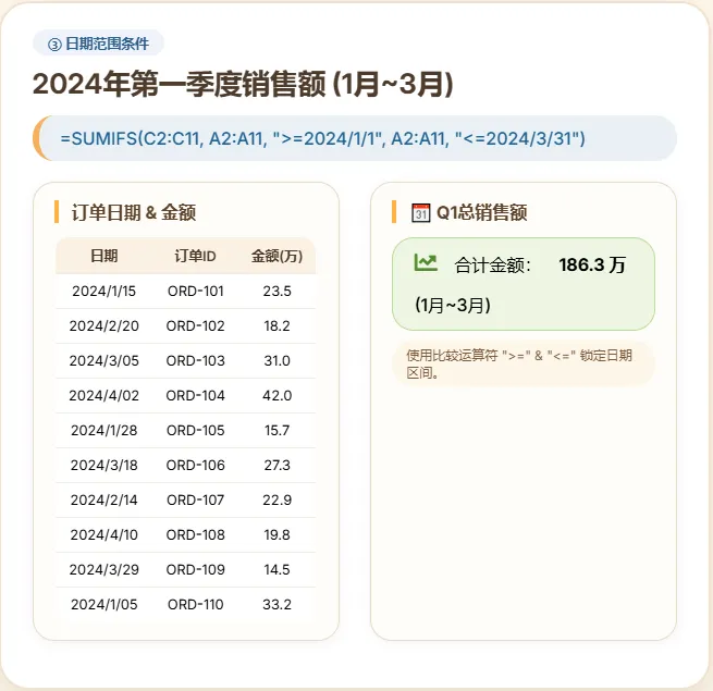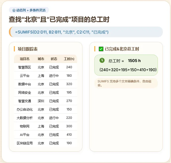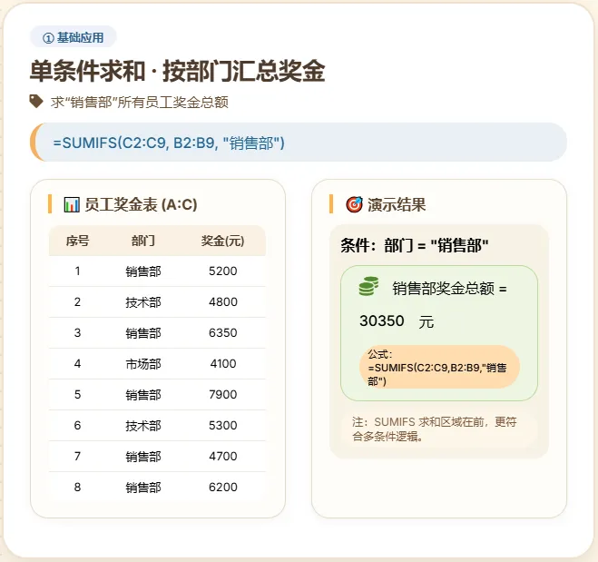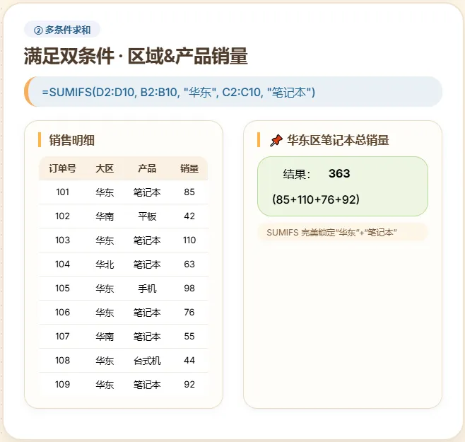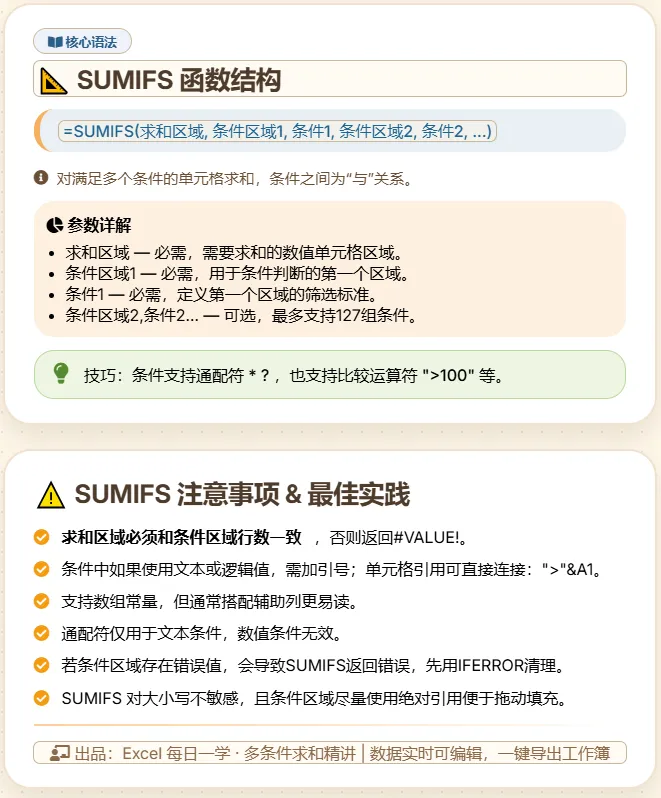 Excel多条件求和,一个SUMIFS函数全搞定! 还在用筛选器一个一个加总?SUMIFS让你告别繁琐操作,一键汇总符合多个条件的数据。无论是按部门、日期区间,还是通配符模糊匹配,它都能精准计算。 我整理了一份SUMIFS精讲笔记,包含8大应用场景,数据表格真实可编辑,还支持一键导出XLSX工作簿,直接复用。函数语法、常见坑点全部理清,Excel新手也能快速上手。 后台回复“SUMIFS”获取完整笔记,让数据汇总更高效。 #Excel技巧 #SUMIFS函数 #办公效率 #数据分析 #函数笔记