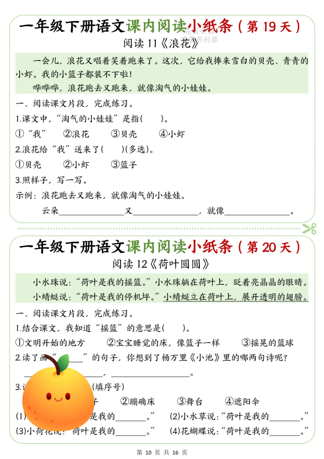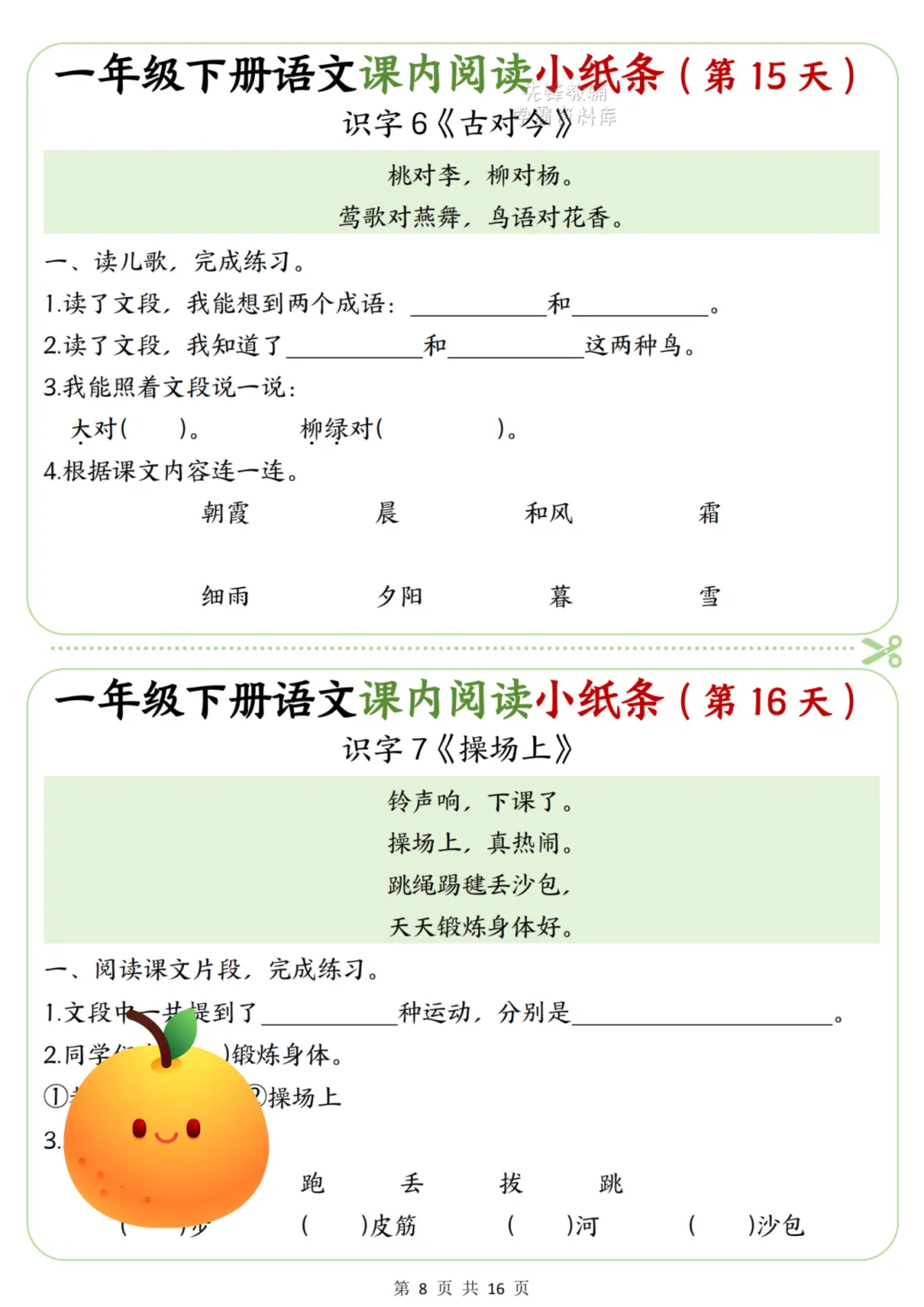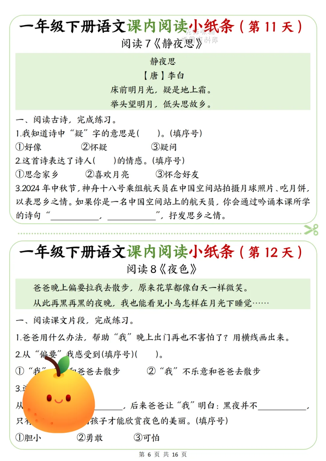 26春《一年级下册语文课内阅读小纸条》电子PDF文档共16页,公益分享,即拿即用,可直接打印。