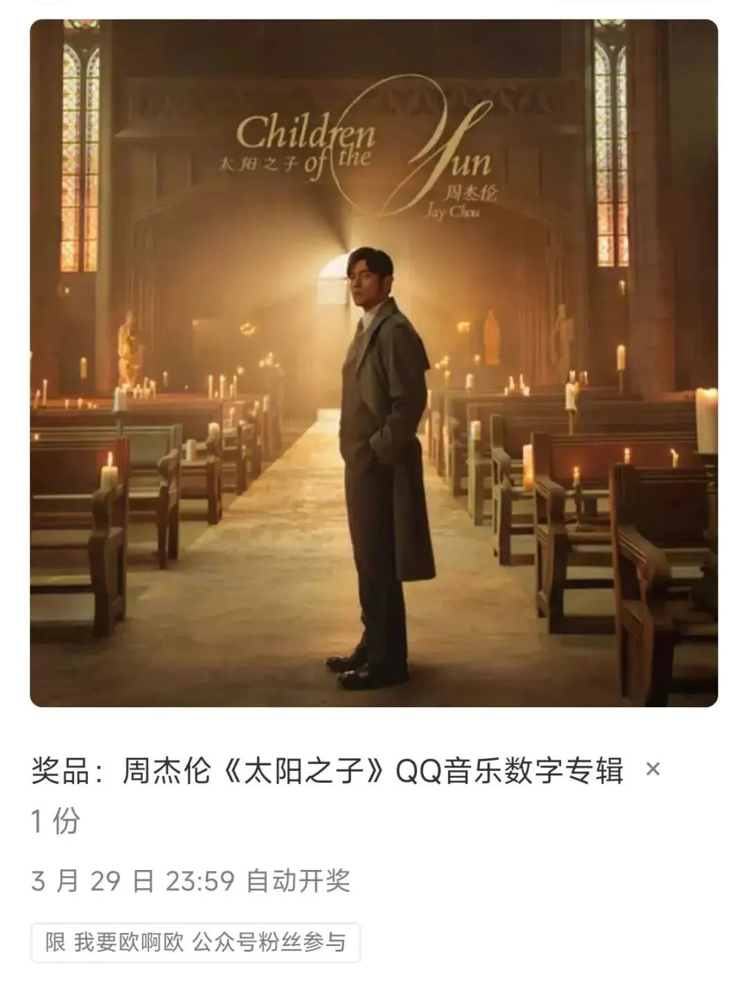 为了庆祝周杰伦新专辑上线,也感谢大家一直以来的支持,本次特意安排抽奖活动,将抽取1位粉丝送出 周杰伦《太阳之子》QQ音乐数字专辑1份。