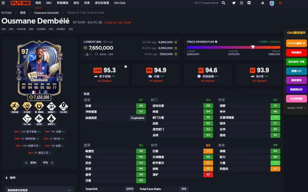 插件现已完美支持FUTGG、FUTBIN、EASYSBC三大 FC26 UT核心网站,翻译内容覆盖游戏全维度核心信息,新手也能轻松看懂: