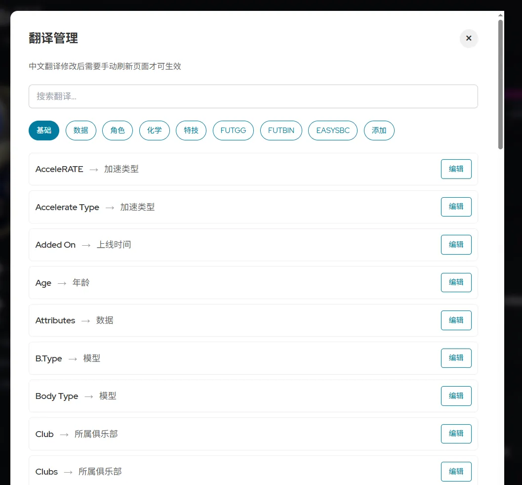 自带强大的翻译管理功能,支持对所有翻译内容进行查看、编辑、添加、恢复,覆盖 FUTGG、FUTBIN、EASYSBC 三大网站专属分类及基础信息、六项数据等通用分类,操作简单易上手!