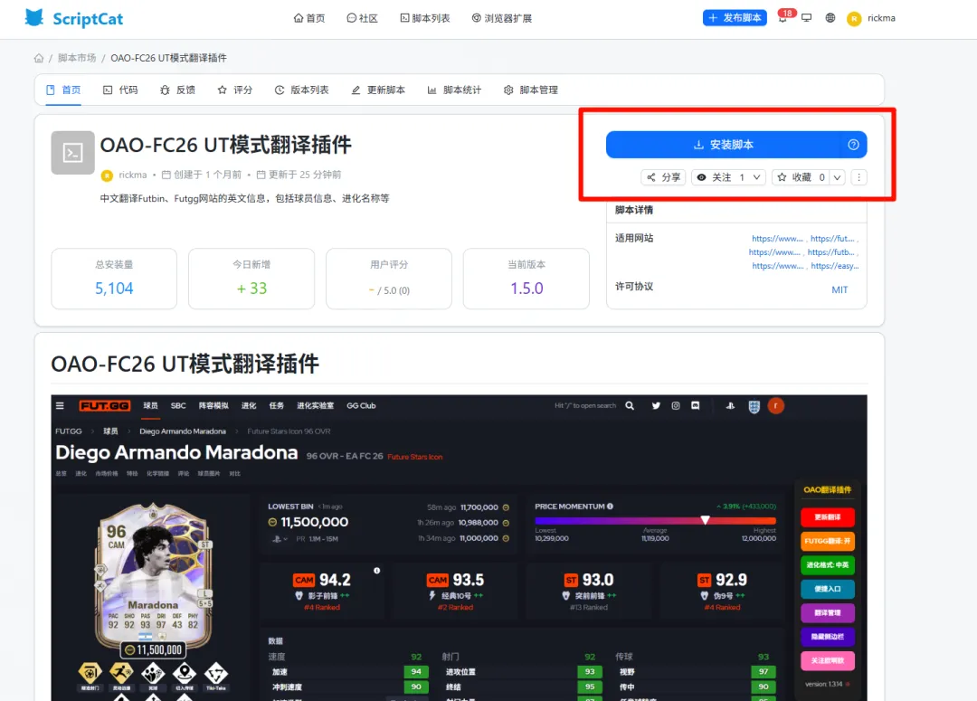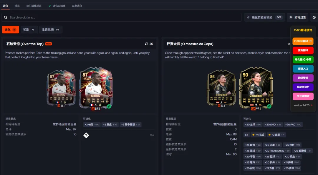 从最初的 FUTGG、FUTBIN 翻译,到进化格式切换、隐藏侧边栏,再到翻译管理功能,如今又新增 EASYSBC 支持,OAO-FC26 UT 模式翻译插件的每一次更新,都源于兄弟们的需求和建议。