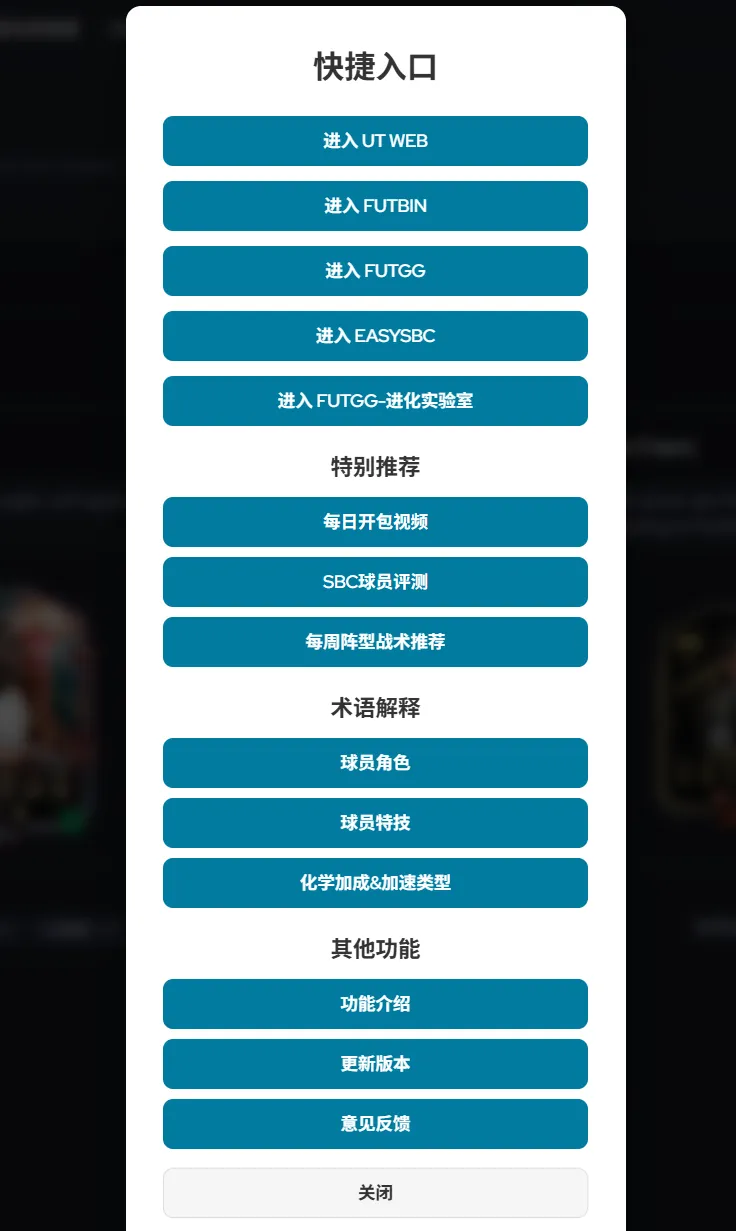 插件配备快捷入口功能,内含 UT WEB、FUTBIN、FUTGG 等常用网站链接,还有欧啊欧专门整理的球员角色、特技、化学加成等游戏术语解析,无需手动收藏,一键直达核心资源,节省查找时间。