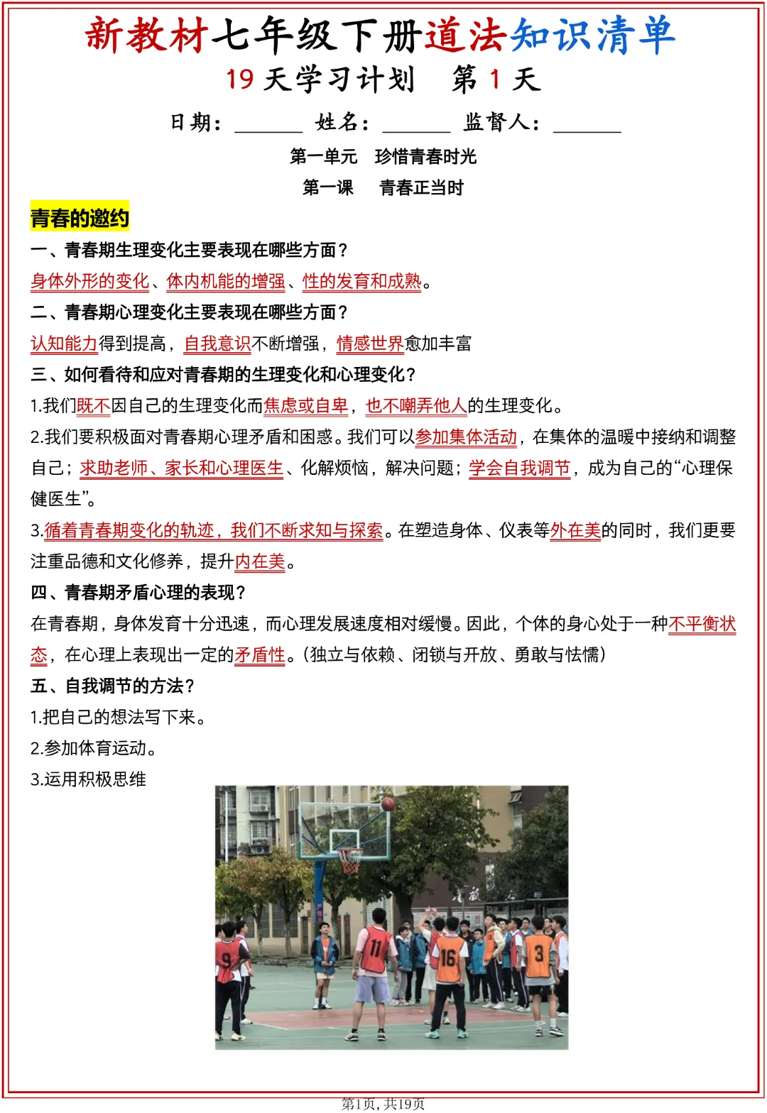 【七年级下册道法通用版】初一下册道法《知识清单19天学习计划》|完整高清可打印