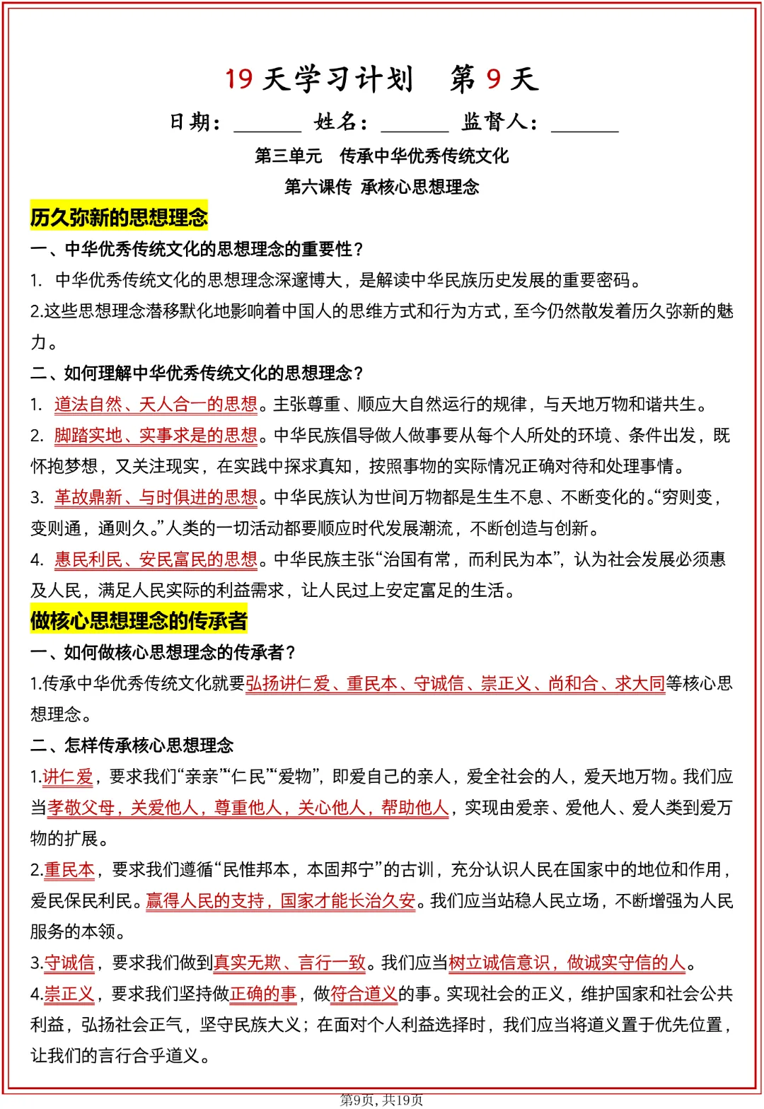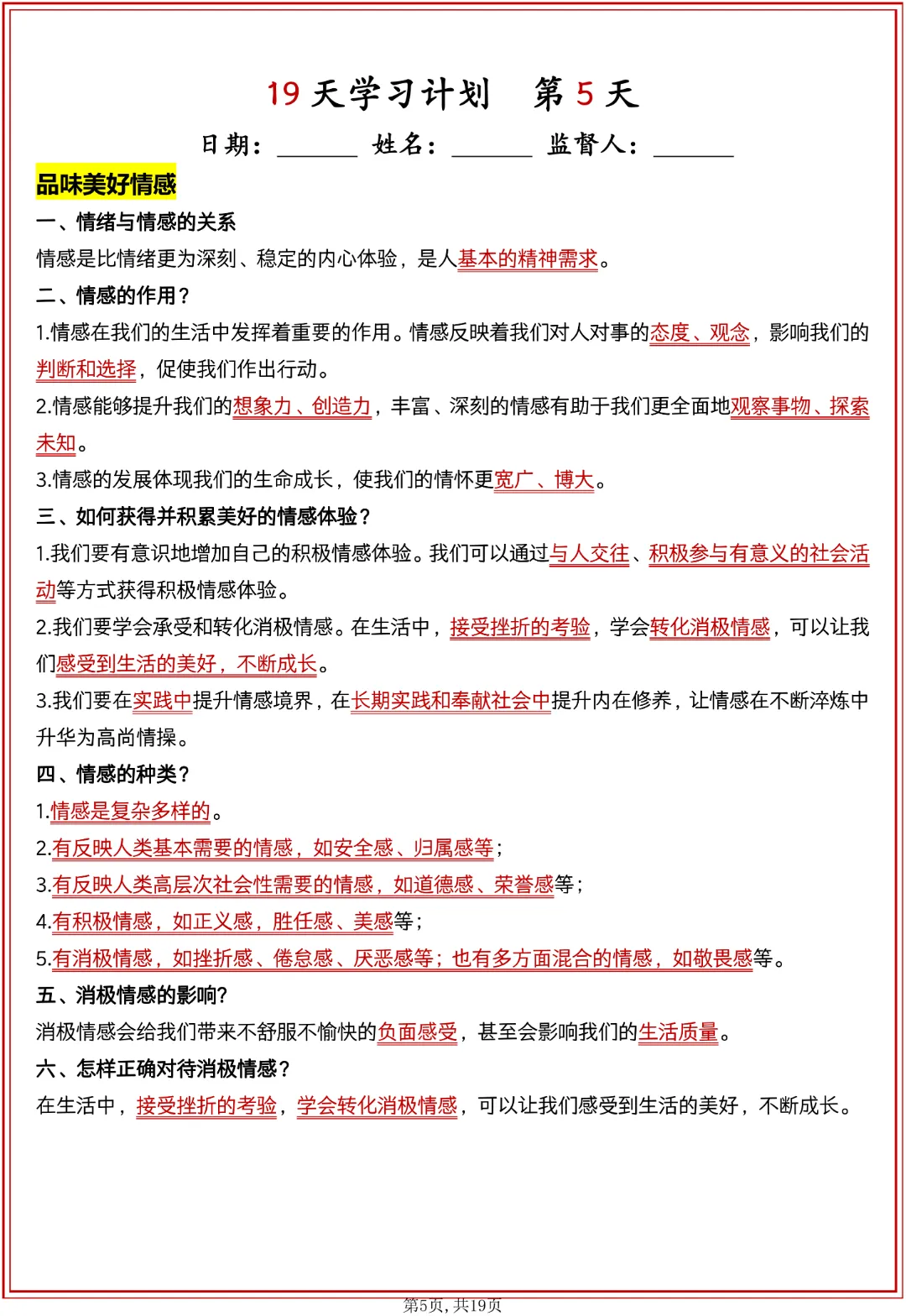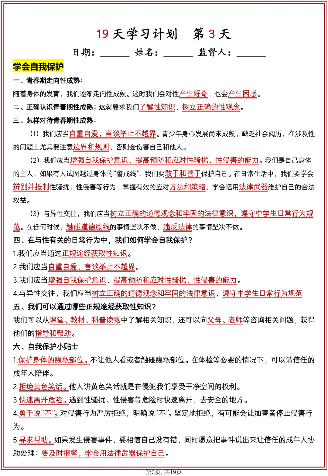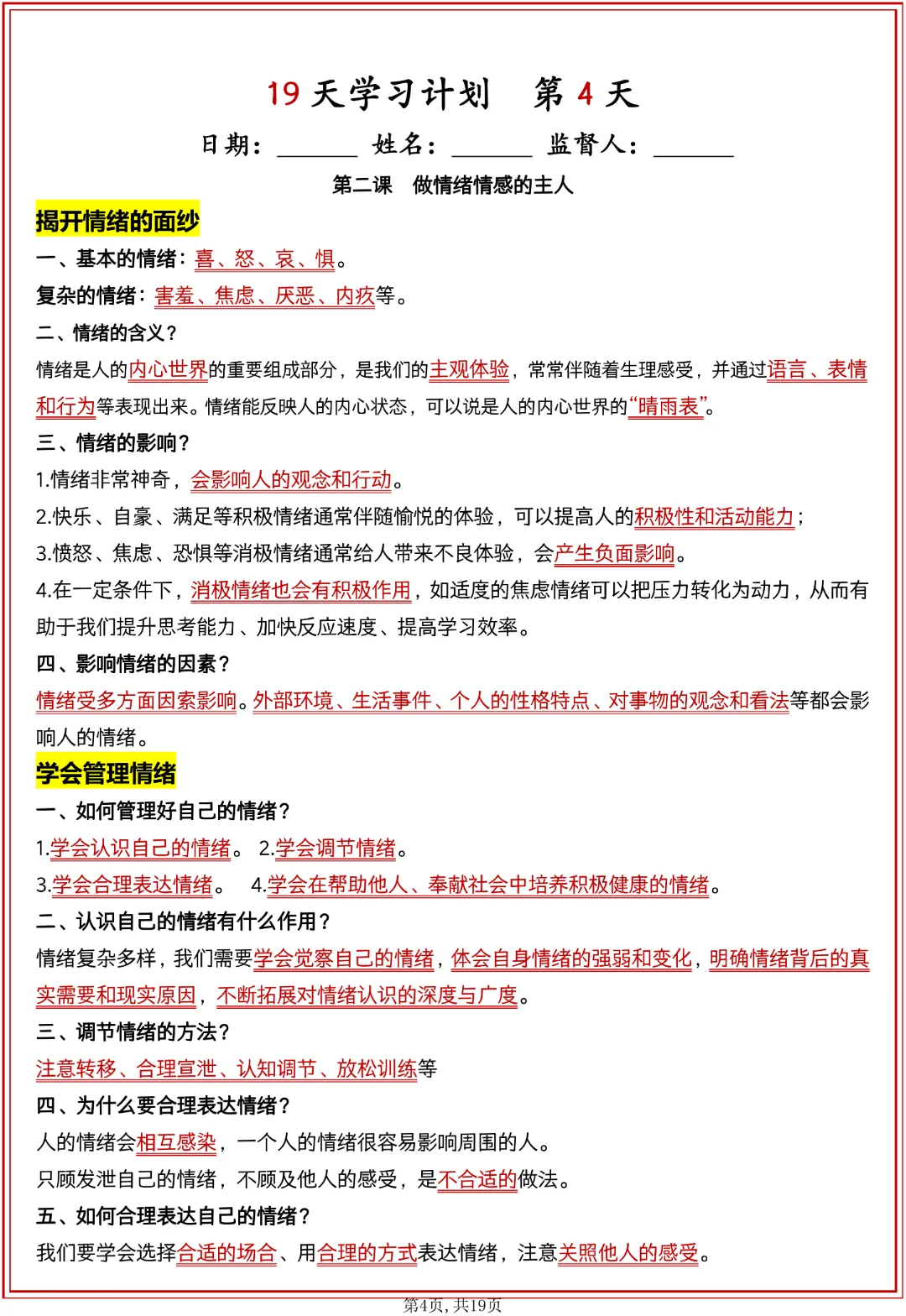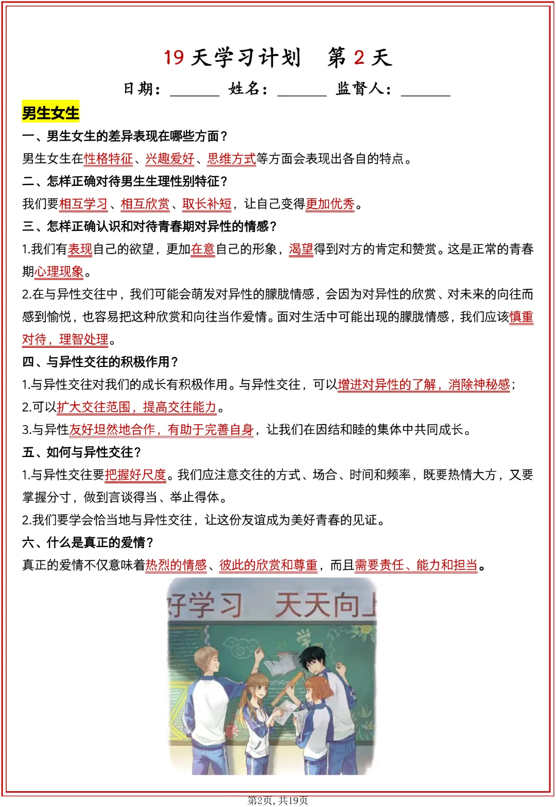 今日给大家分享的是:【七年级下册道法通用版】初一下册道法《知识清单19天学习计划》|完整高清电子版可打印