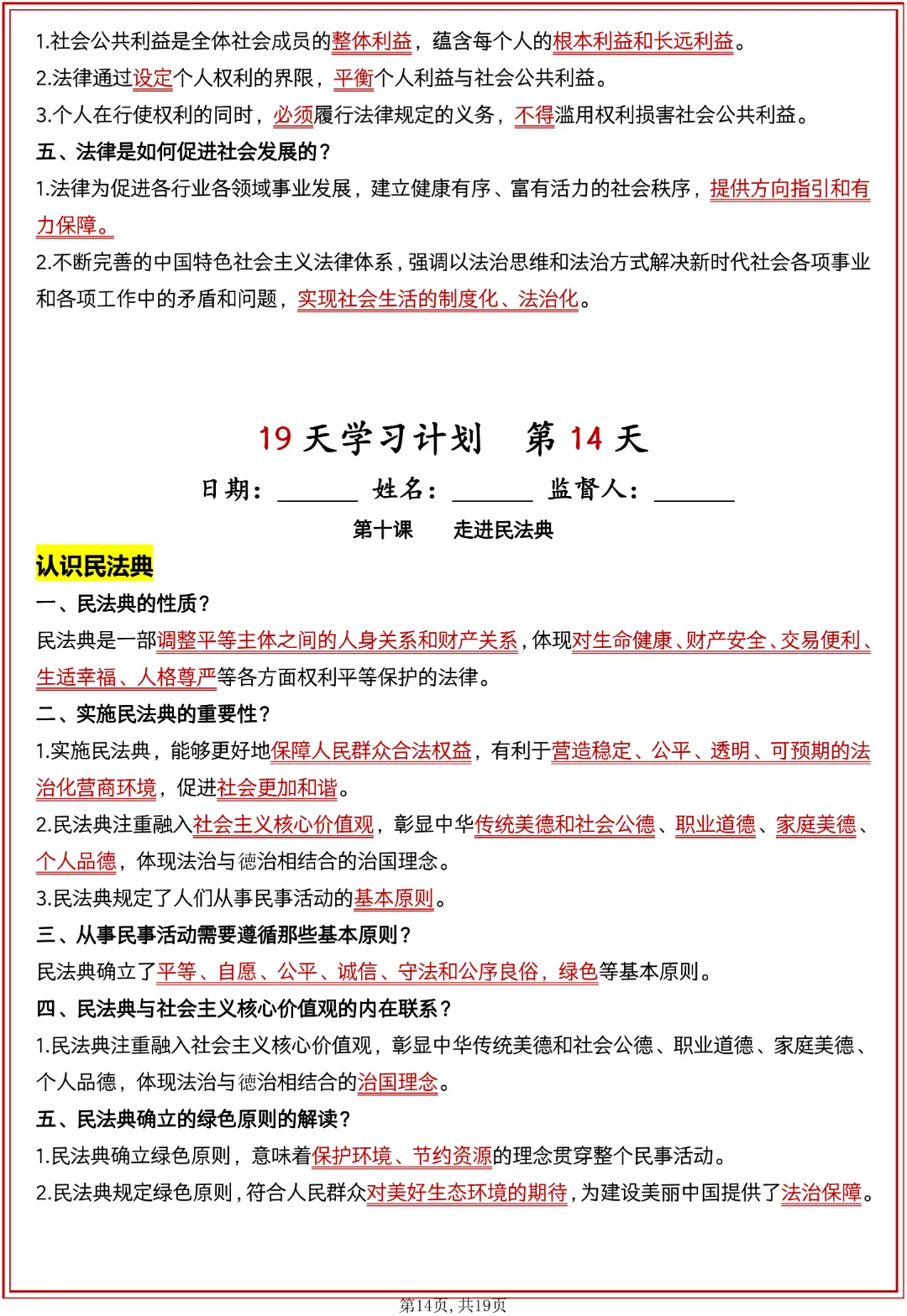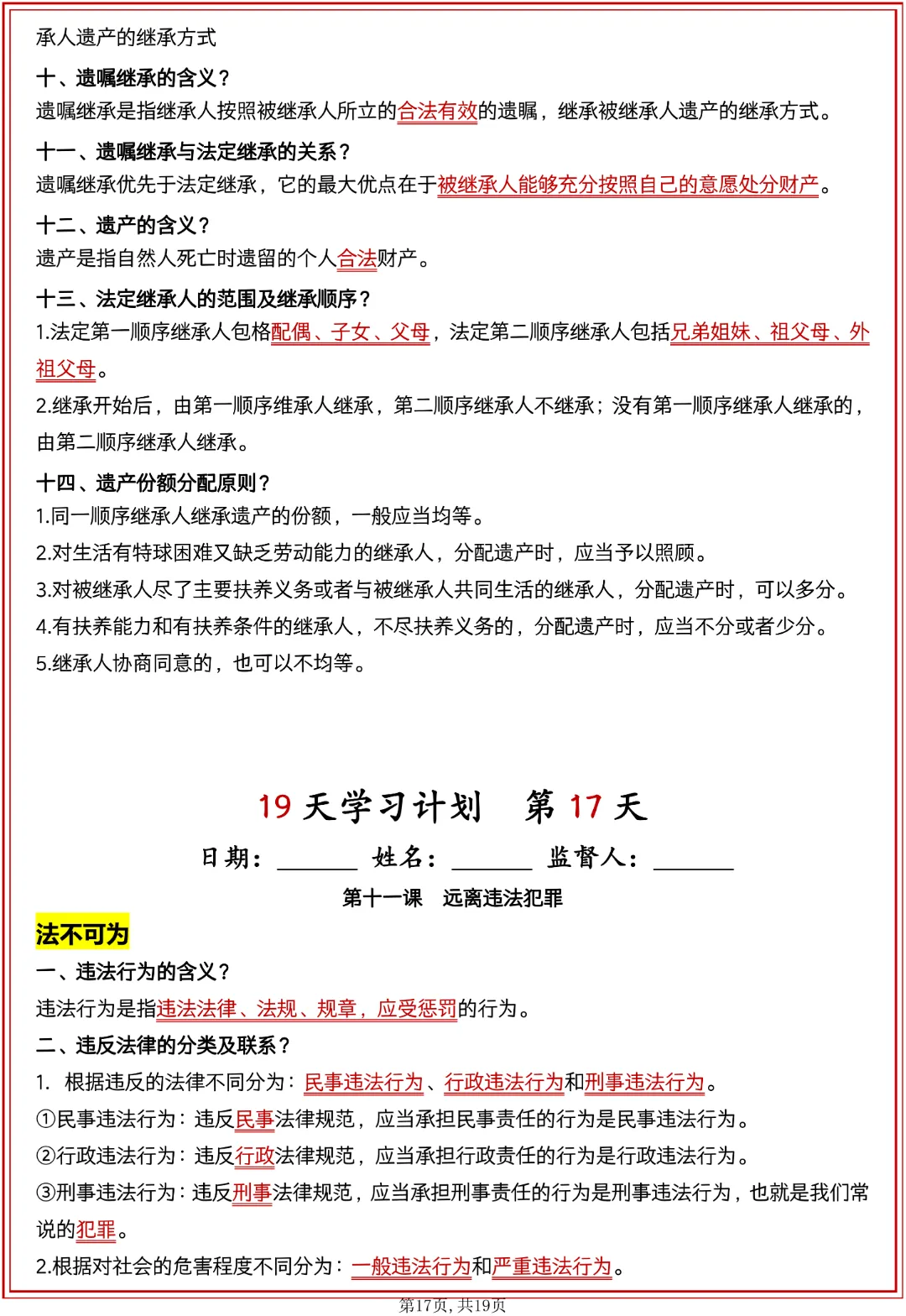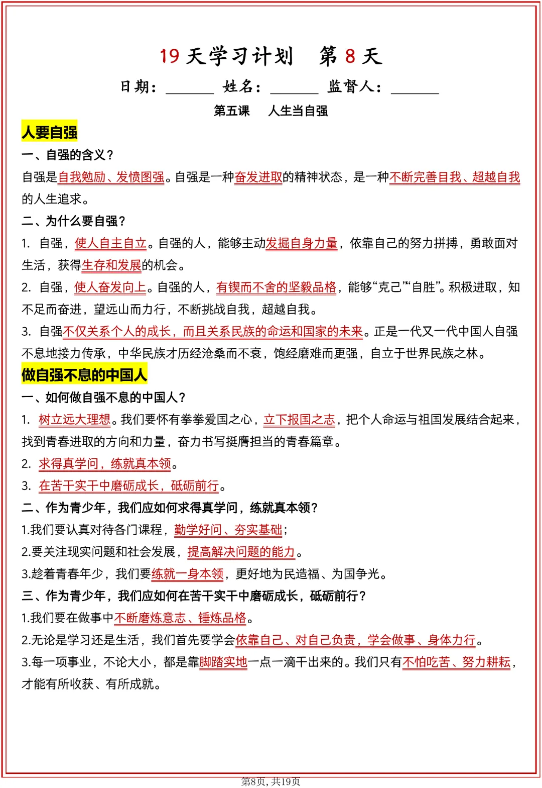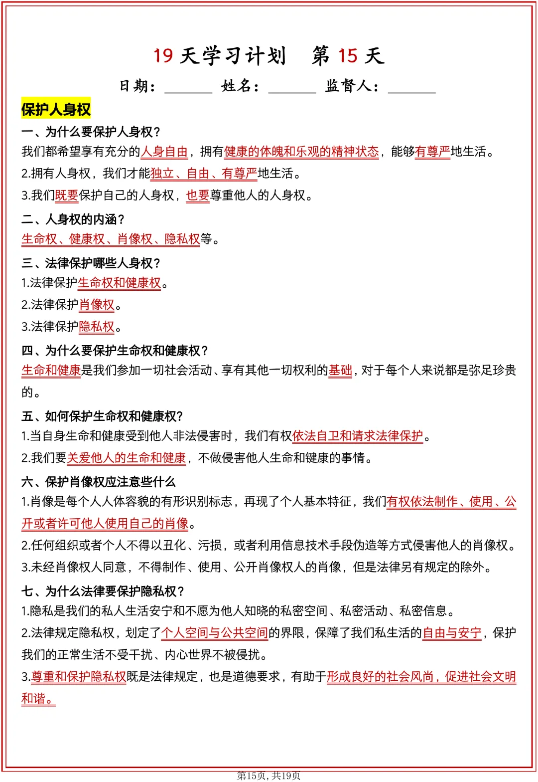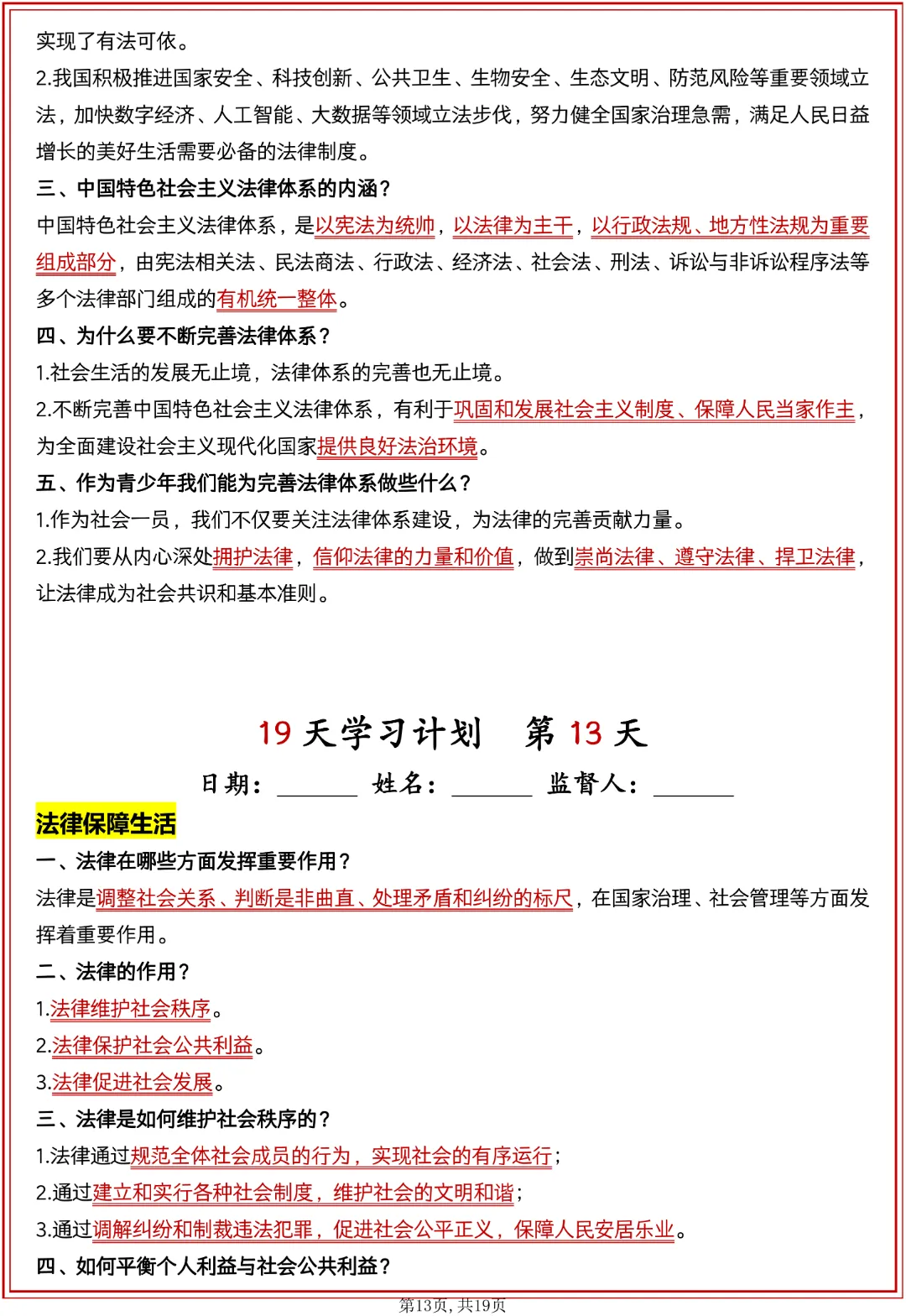 今日给大家分享的是:【七年级下册道法通用版】初一下册道法《知识清单19天学习计划》|完整高清电子版可打印