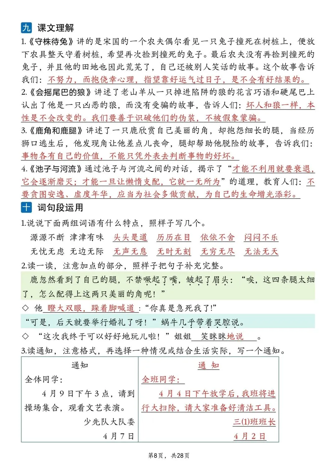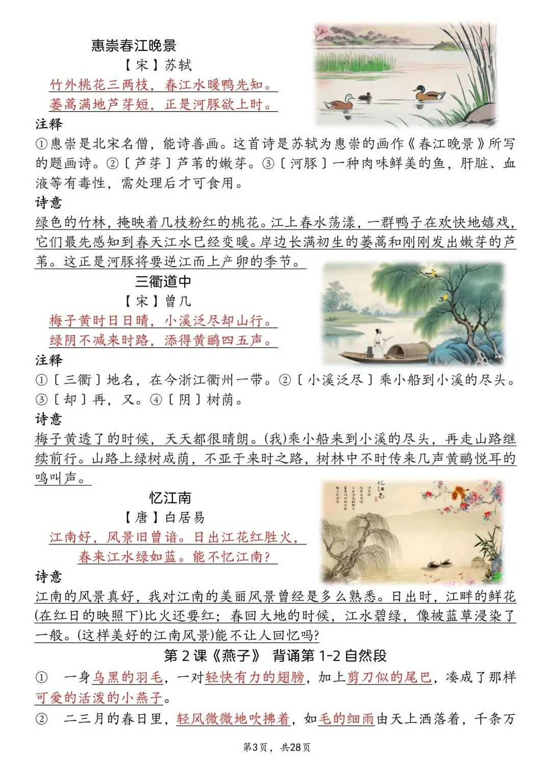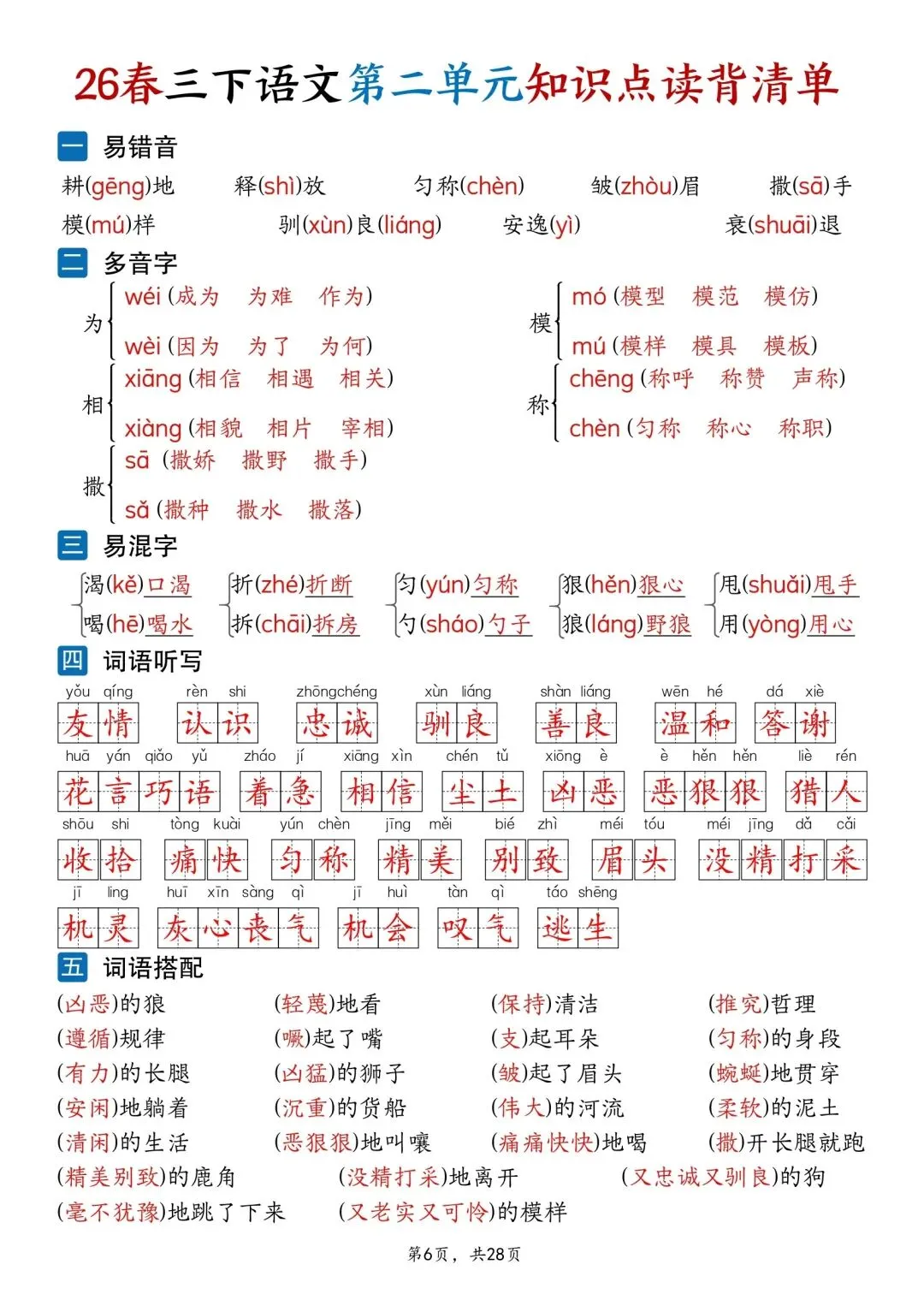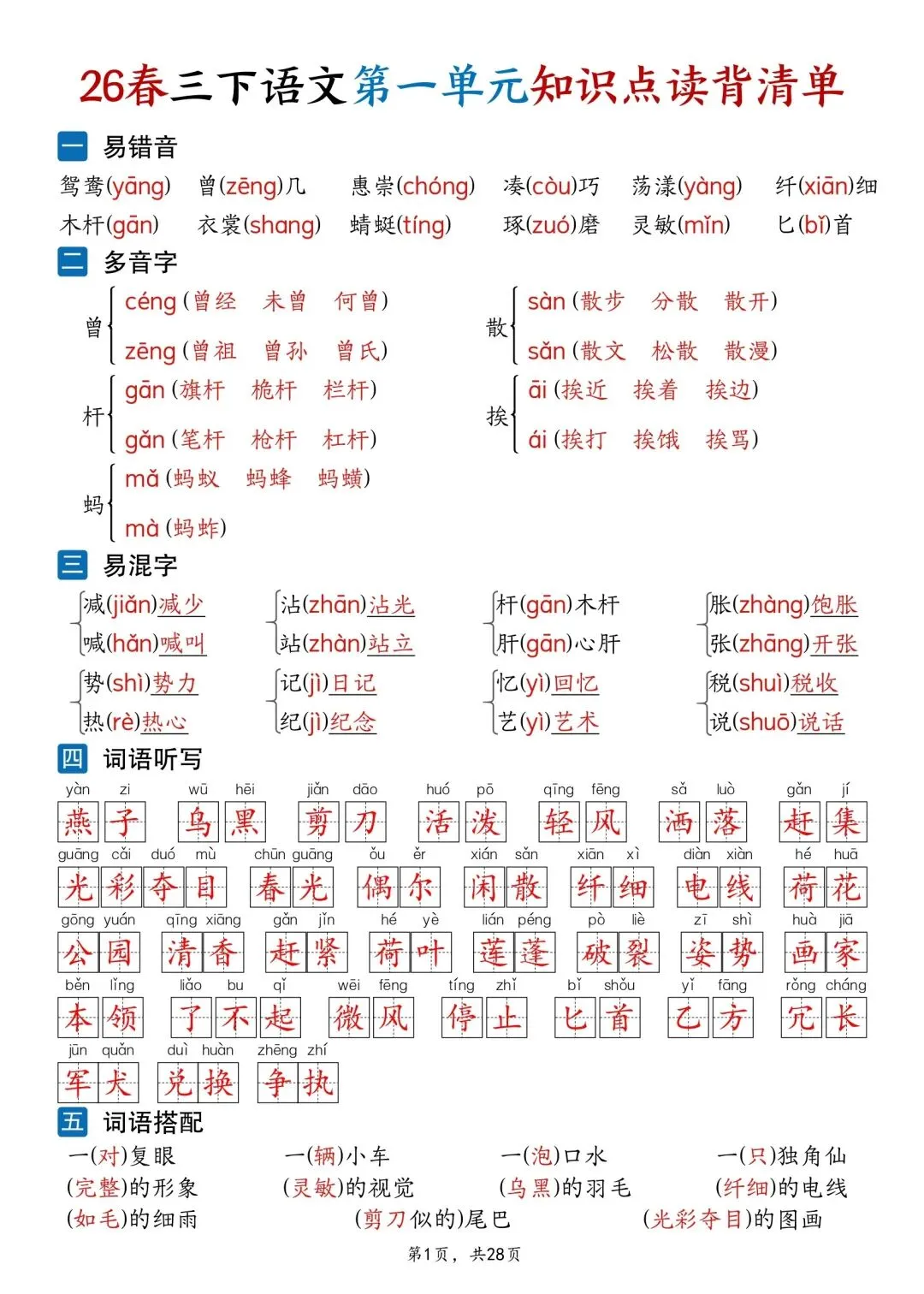 26春三年级下册语文1-8单元知识清单汇总高清电子版可打印
