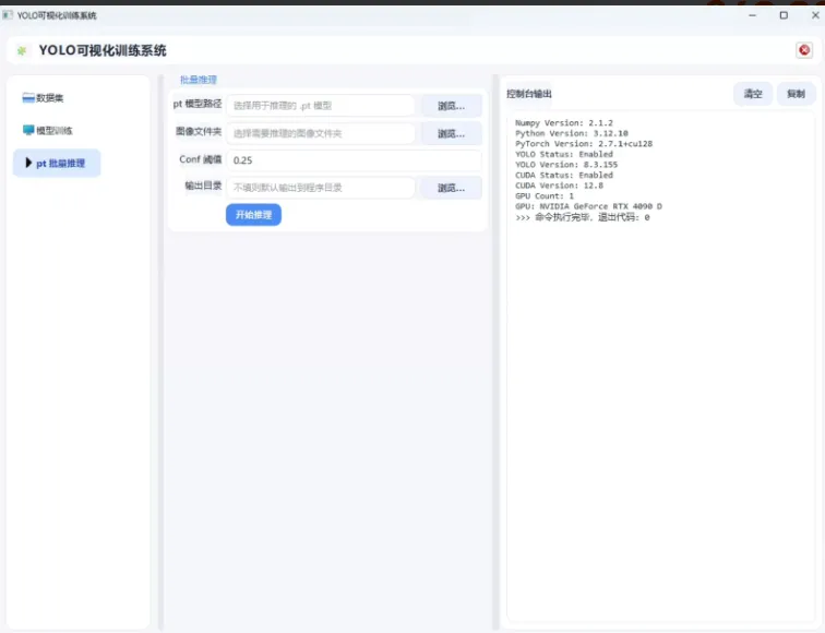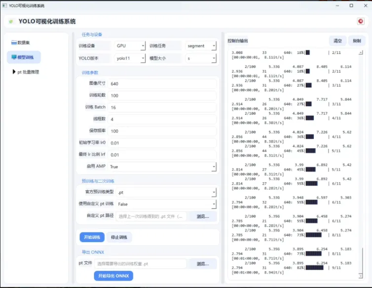 训练完成后,进入「pt批量推理」→选择训练好的pt模型+测试图片目录→设置置信度阈值→点击「开始推理」,结果自动保存(图片+坐标+类别),同时可导出ONNX模型用于部署。
