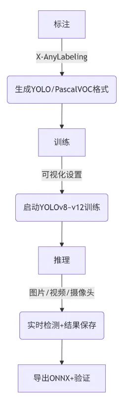 标注、训练和推理全流程集成,完全可视化操作,支持yolov8~yolov12模型训练,一键导出onnx以及模型验证,支持目标检测,obb,分类,分割,关键点多种视觉任务,支持n、s、m不同量级模型!