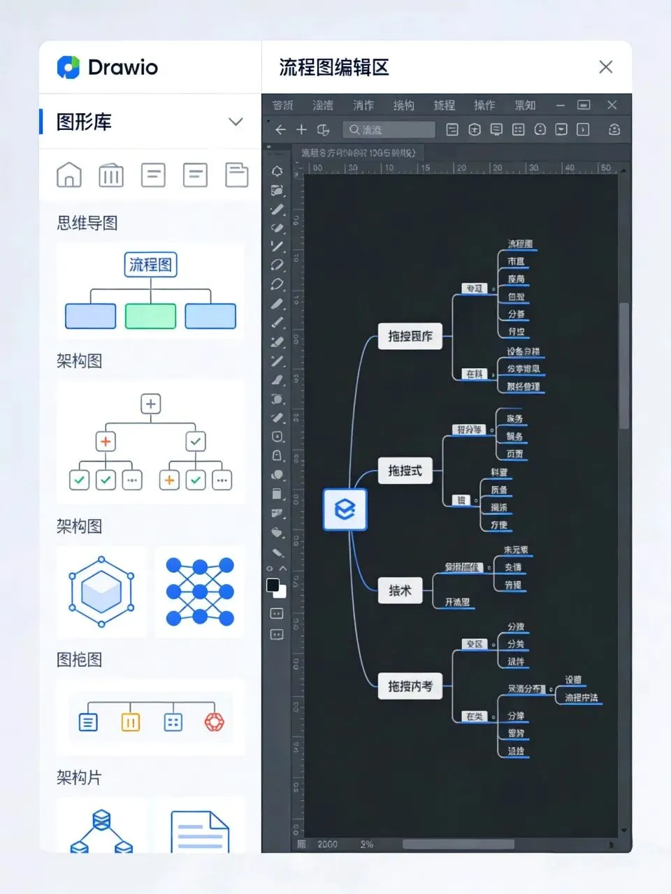 配图建议:Draw.io网页版界面,展示流程图绘制+丰富图形库