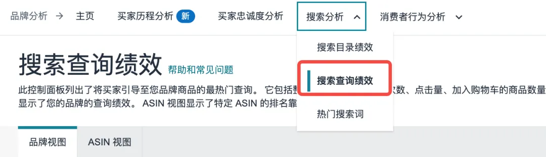 进入亚马逊后台 -> 品牌分析,选择搜索查询绩效,视图选择 ASIN视图,选择你要分析的ASIN和时间范围(周/月)。点击右上角 生成下载。