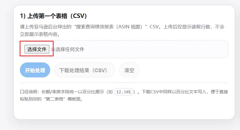 告别Excel公式。只需要把亚马逊后台导出的原始CSV文件拖进去,点一下开始处理,所有关键指标(市场CTR、市场CVR、各环节份额)自动计算完成。